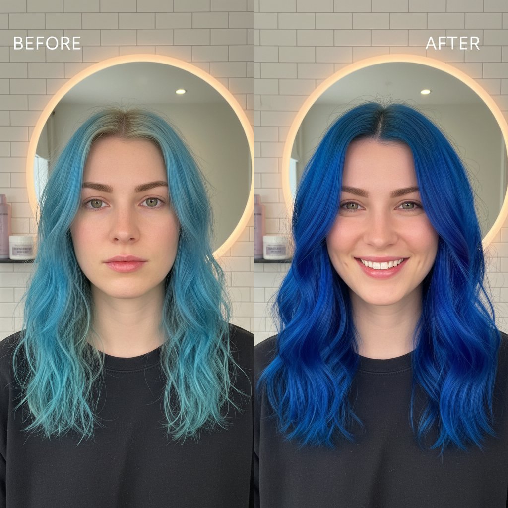 Before: Electric blue fading into a pale imitation. After: Revitalized, electric blue shades popping with vibrancy, courtesy of color-depositing masks.