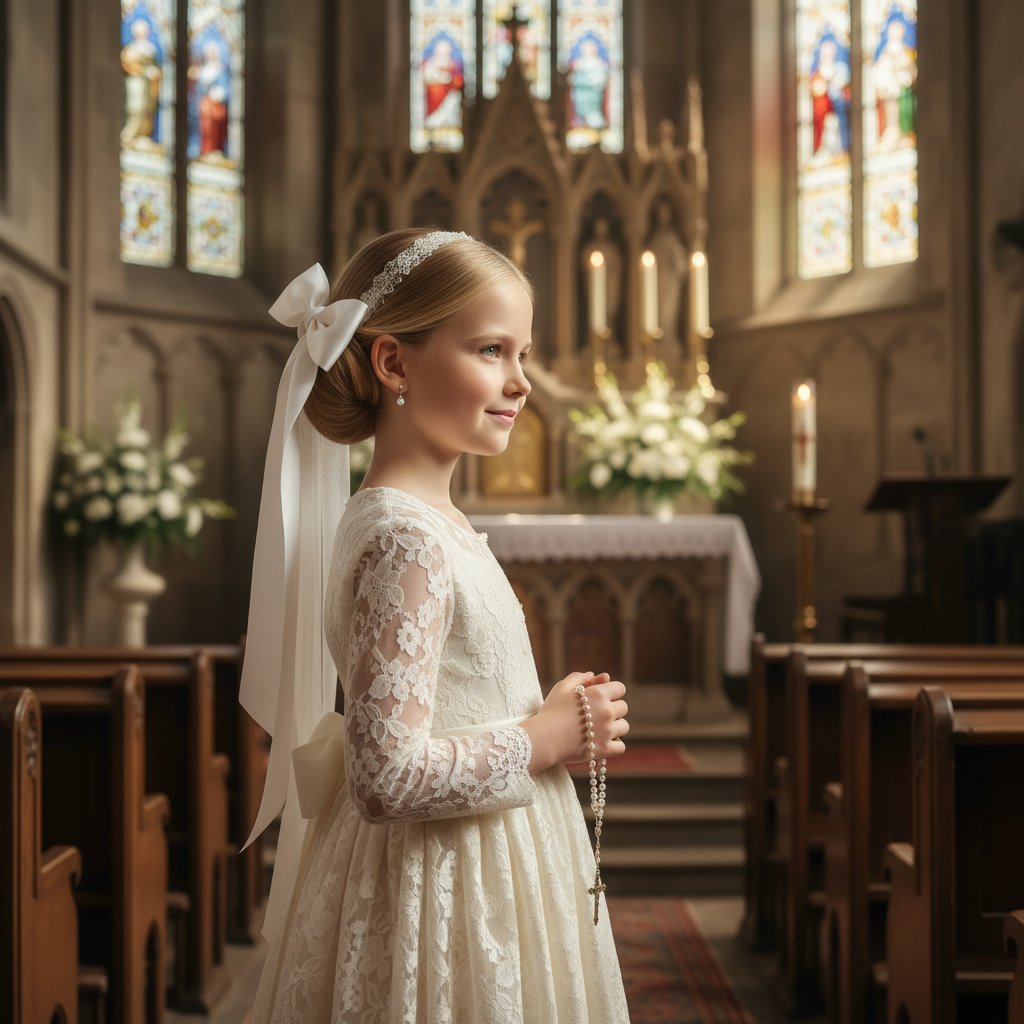 A sleek, low ponytail tied with a satin bow, reflecting the child's graceful approach to this significant spiritual milestone.