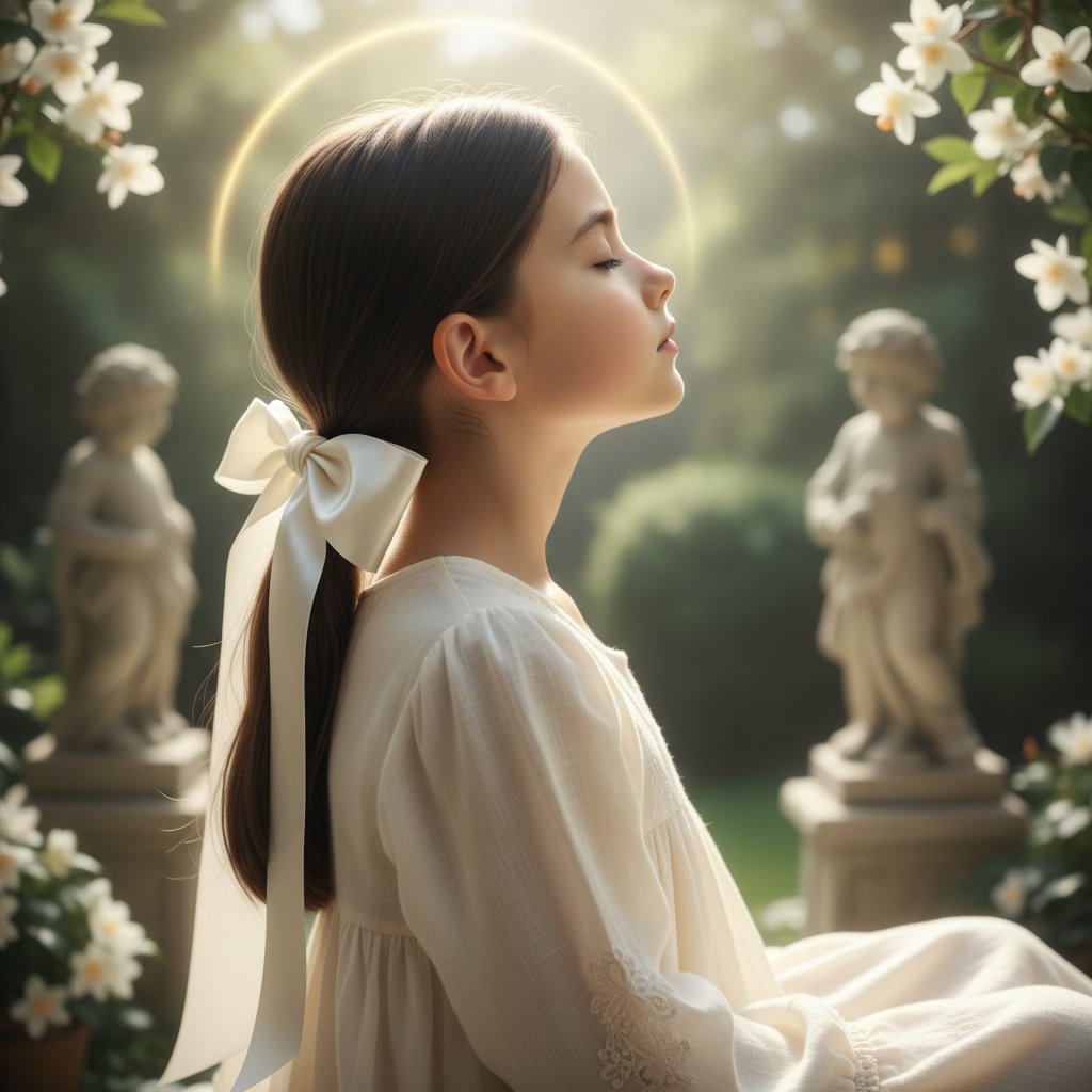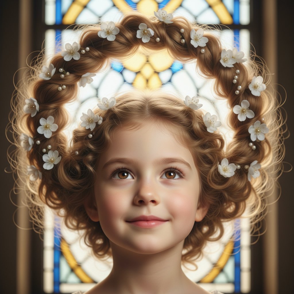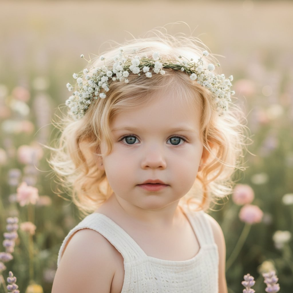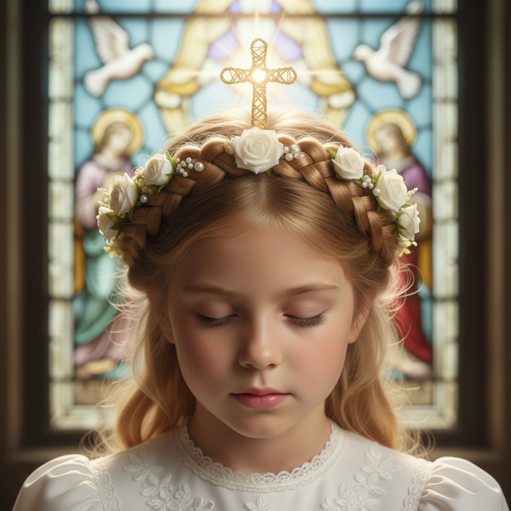 A delicate wreath of baby’s breath placed upon softly curled hair, embodying the innocence and purity of early faith.
