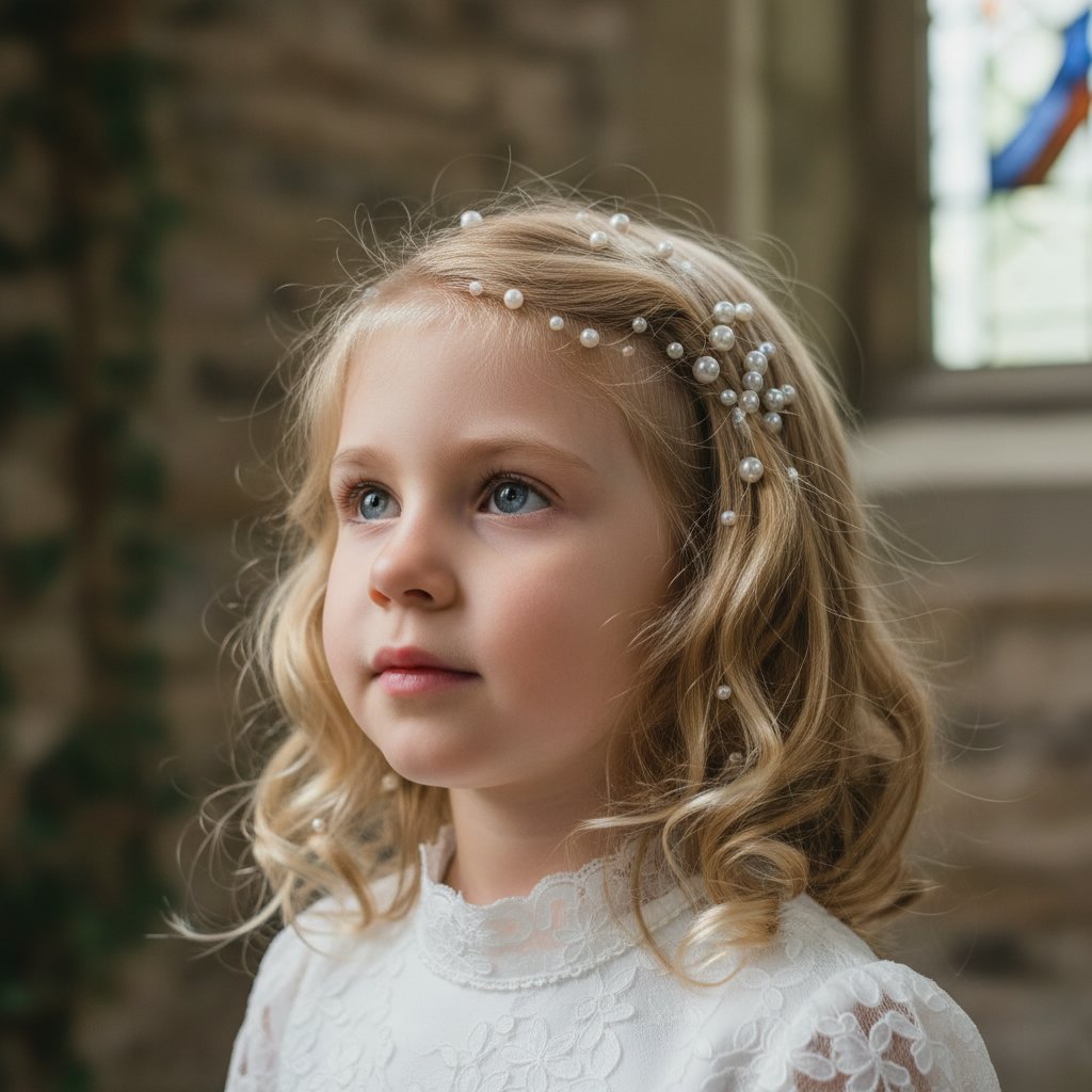 Gently curled locks pulled half-up, adorned with a delicate floral accessory, representing the innocence and joy of the occasion.