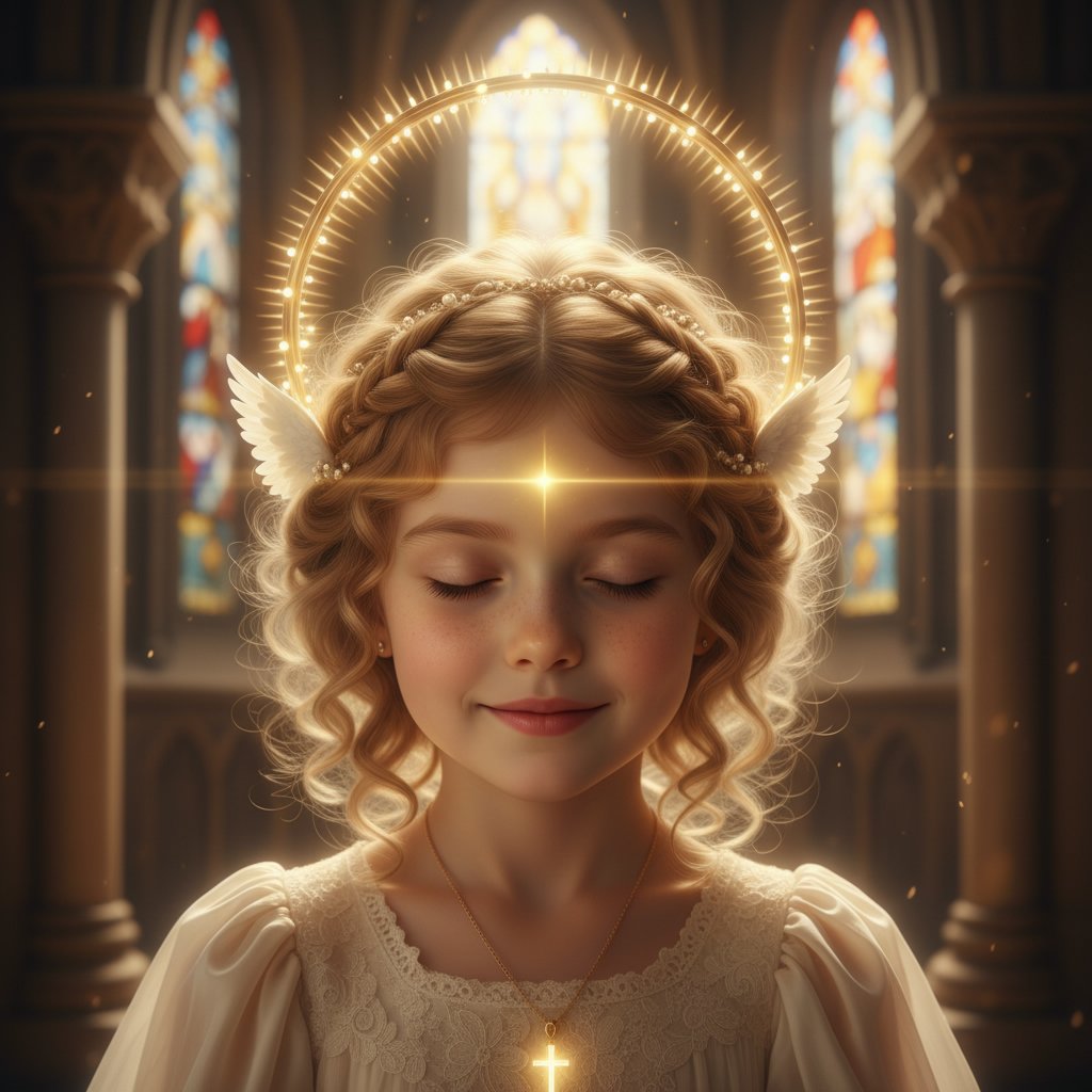 Hair styled to accommodate an angelic halo headband, signifying the child's connection to the divine on this holy day.