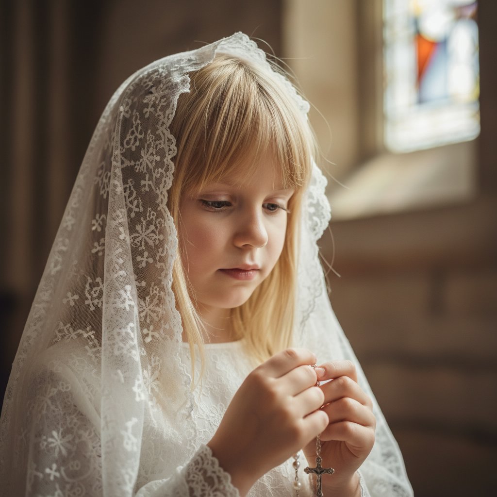 Straight, simple locks allowed to fall naturally beneath a traditional communion veil, signifying reverence and humility.