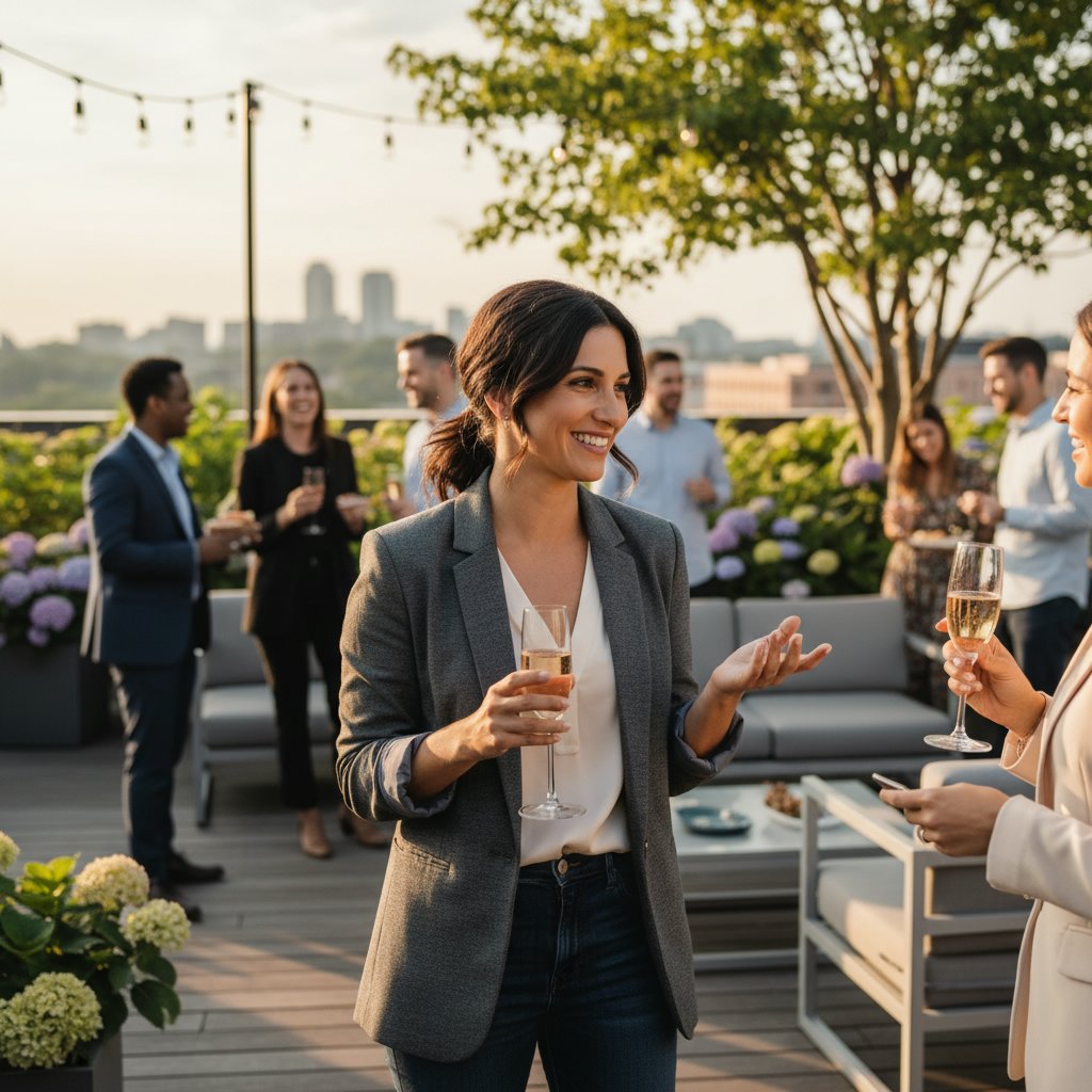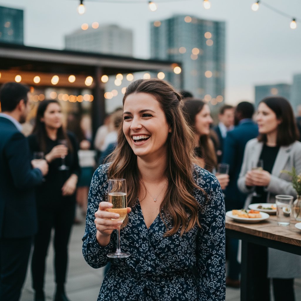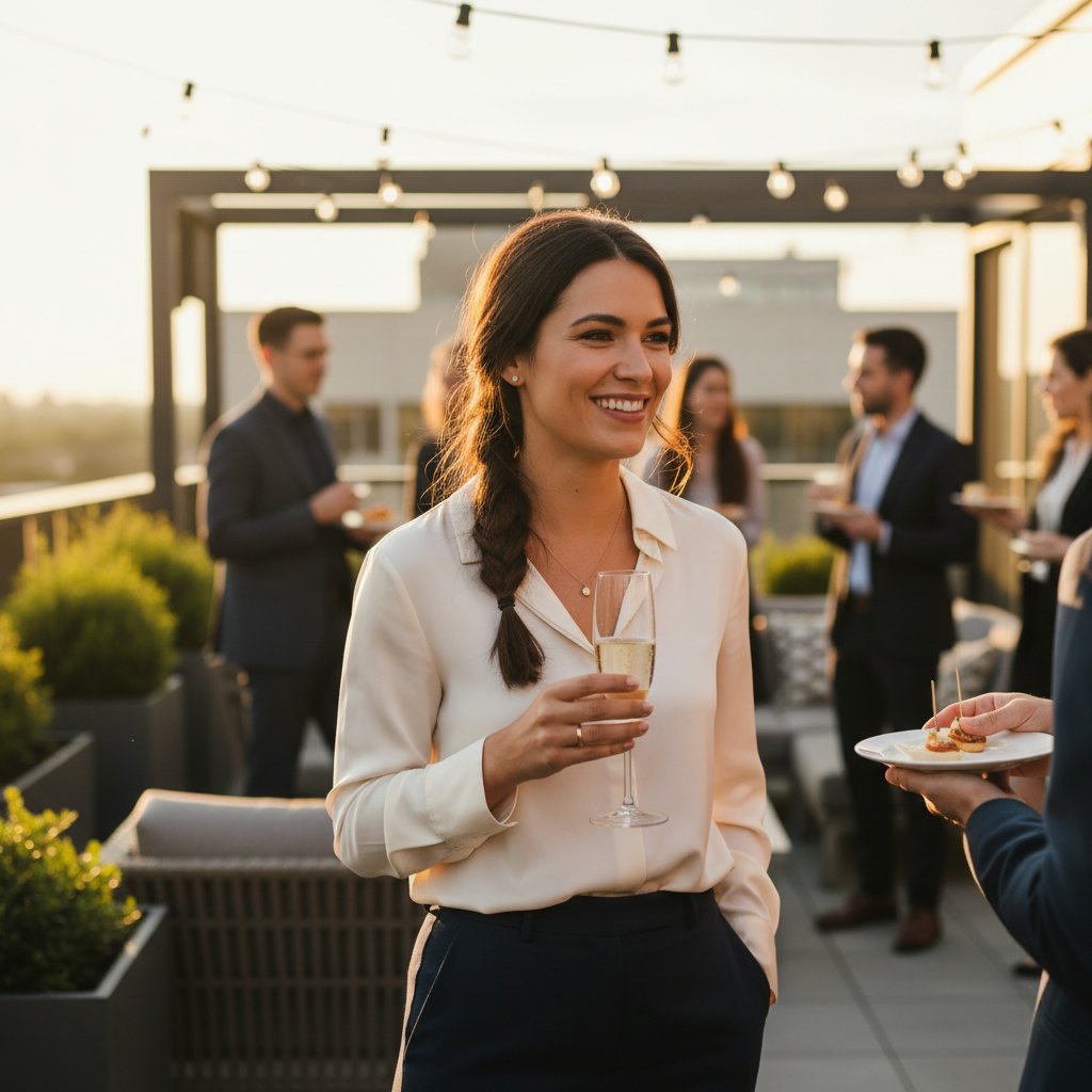 A playful ponytail with loose strands framing the face is ideal for a friendly and approachable look at any company gathering.