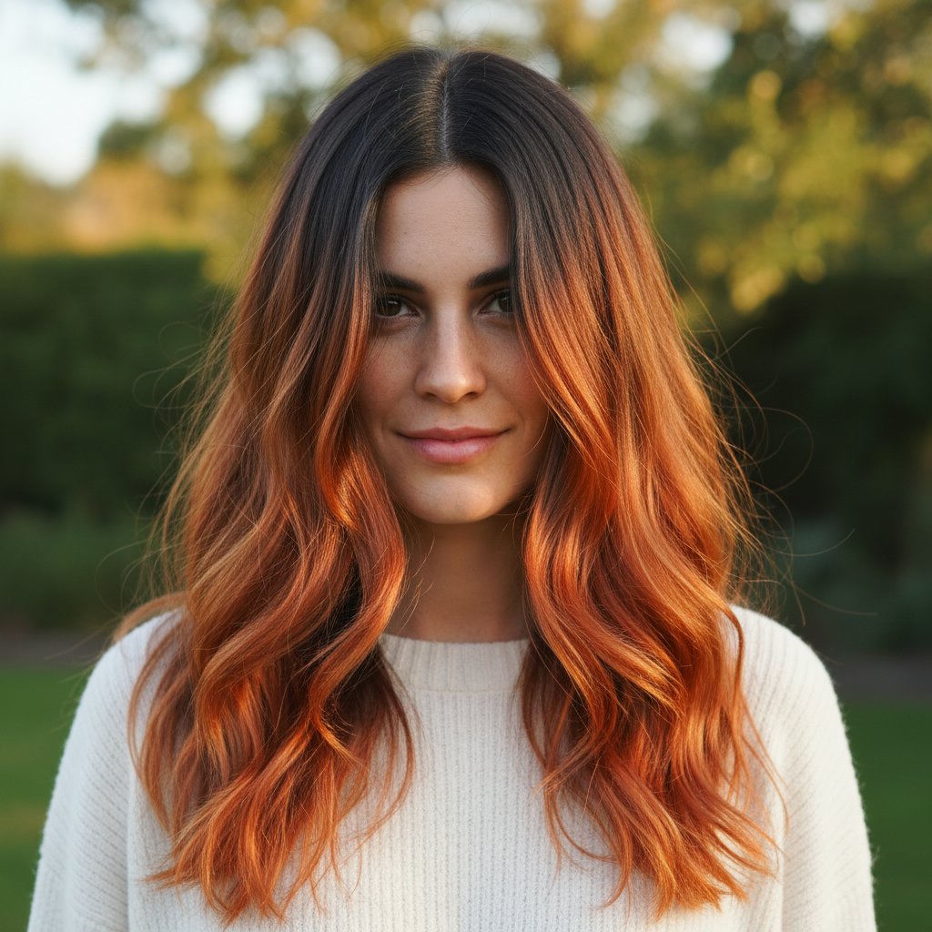 A seamless ombre transition from darker roots to luminous copper ends, creating a striking contrast and vibrant look.