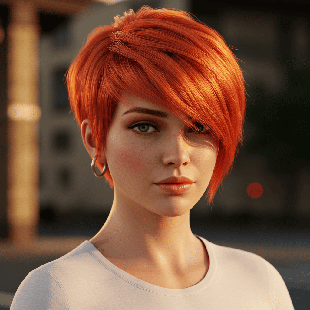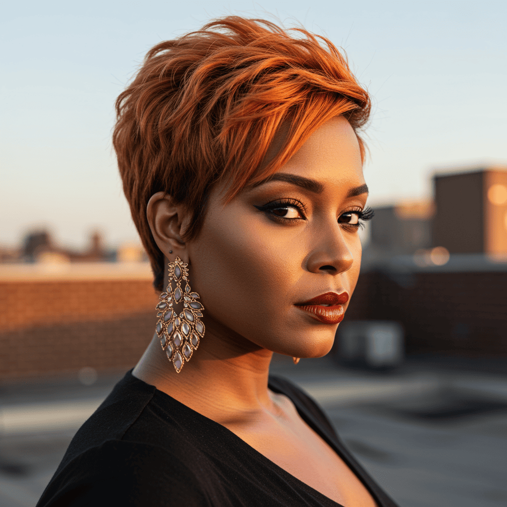 Sunset copper in a pixie cut maximizes color impact with its orange-pink blend, perfect for showcasing facial features.