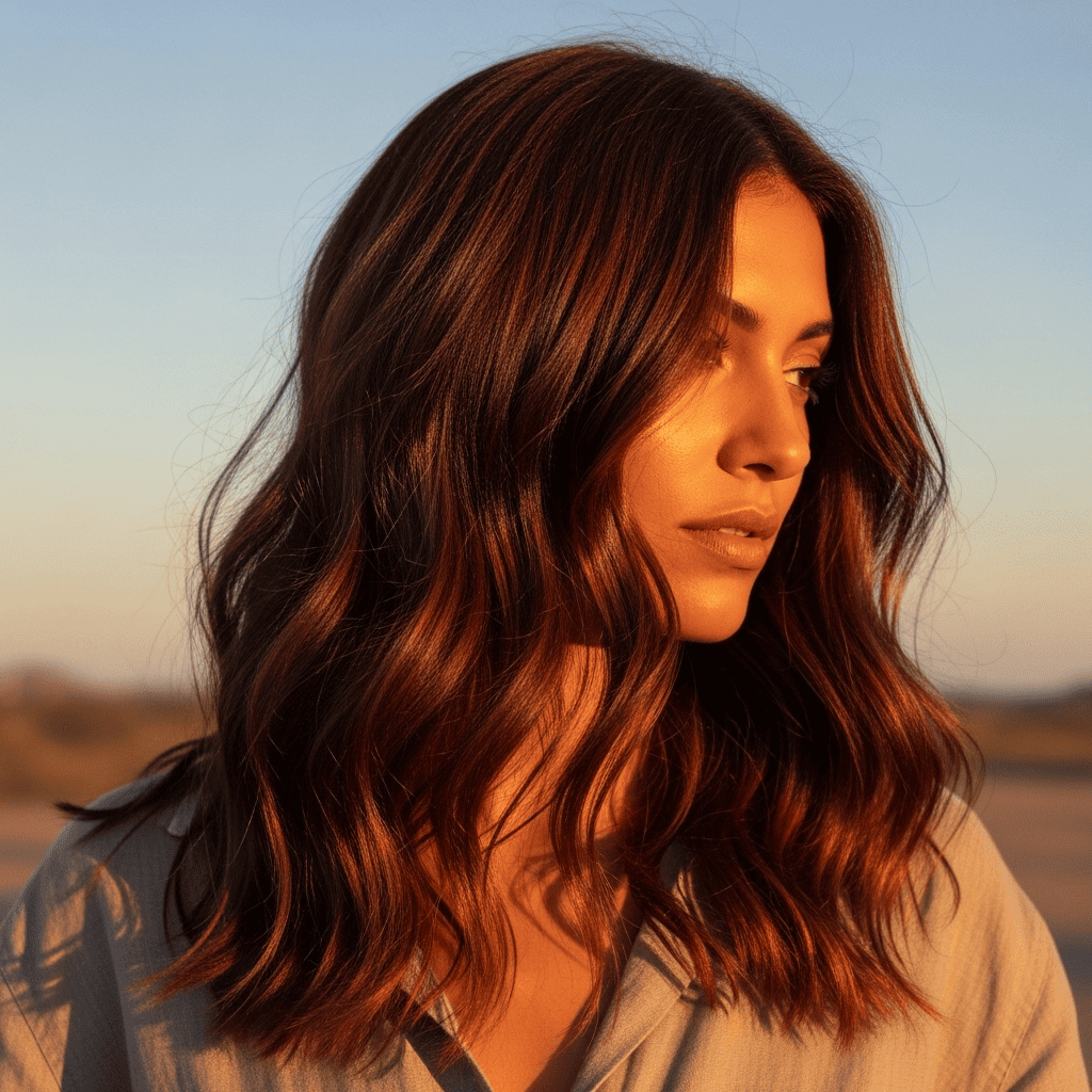 Copper bronze waves combine two metallic tones for a luxurious, sun-kissed effect that enhances olive skin tones.