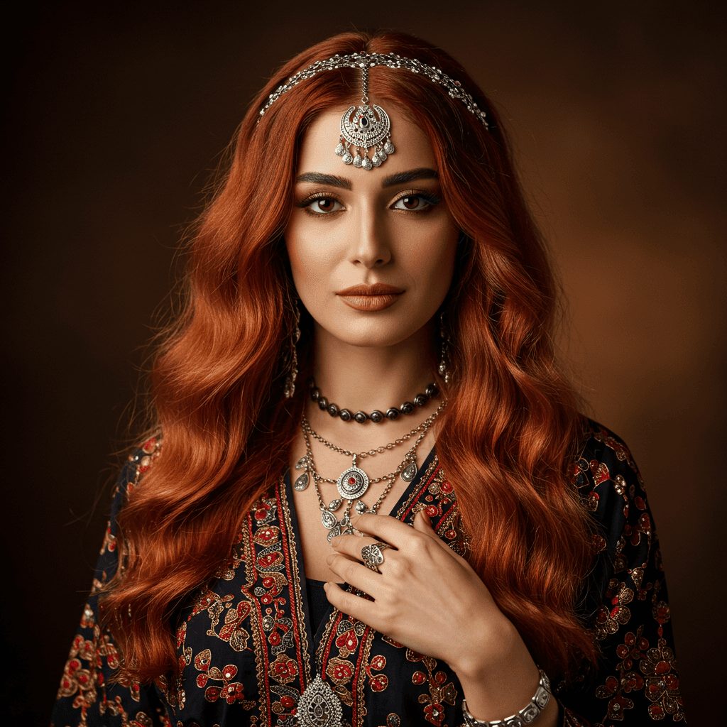 Henna copper showcases natural plant-based color with its characteristic orange-red tones that beautifully complement Middle Eastern skin tones.
