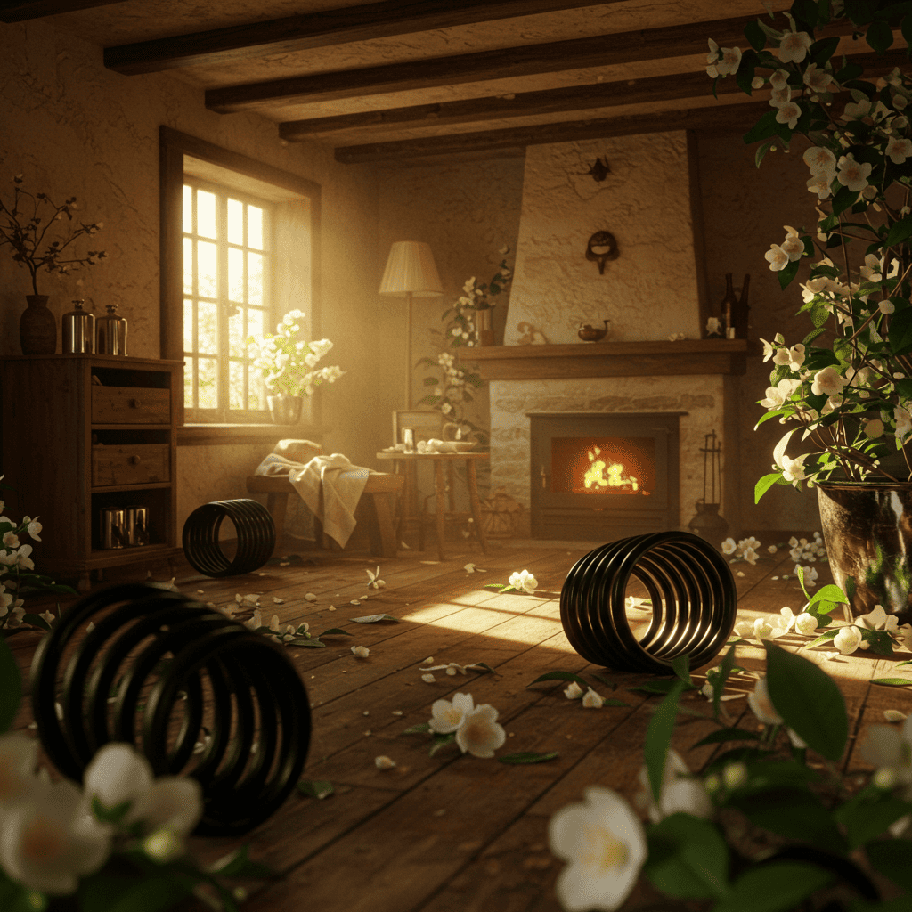 Beautiful natural coils adorned with jasmine flowers in a cozy cottage setting.