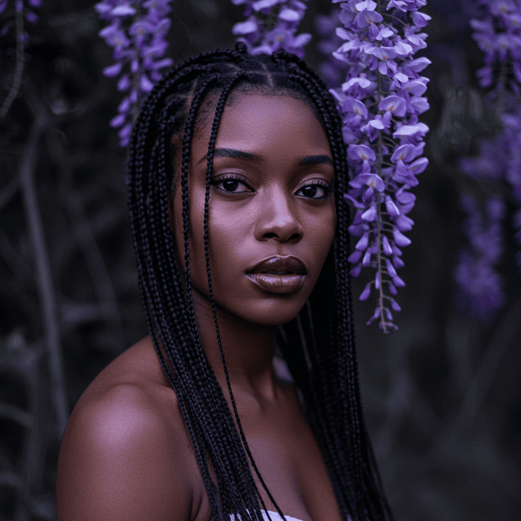 Cascading hair adorned with hanging wisteria creates a romantic garden aesthetic.