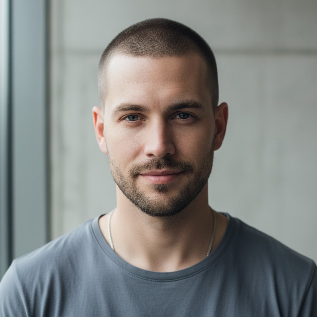 The buzzed crew cut is a minimalist approach, where the hair is clipped very short for a low-maintenance, clean appearance.