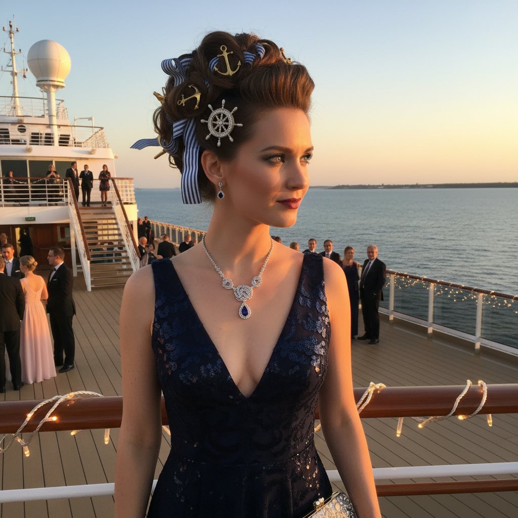 An intricate updo adorned with nautical accessories, designed for evenings of elegance under the stars.