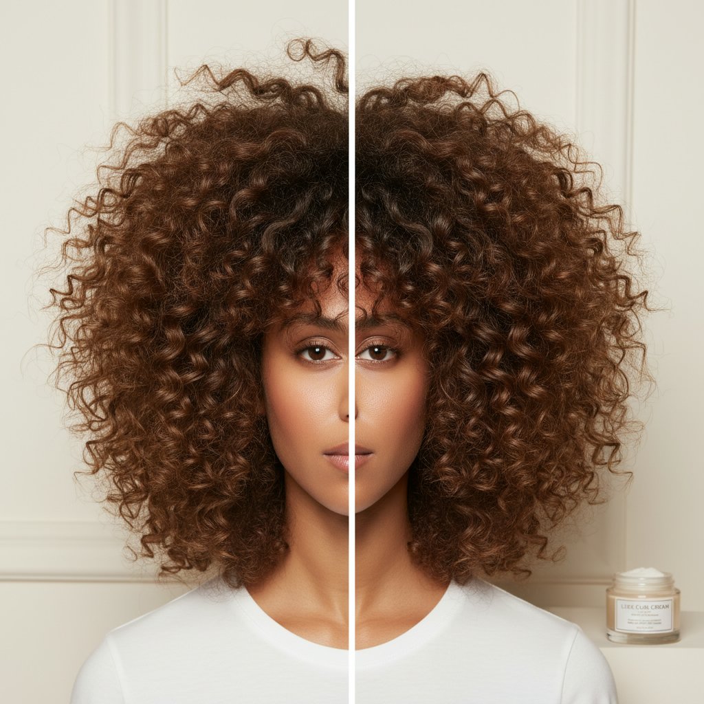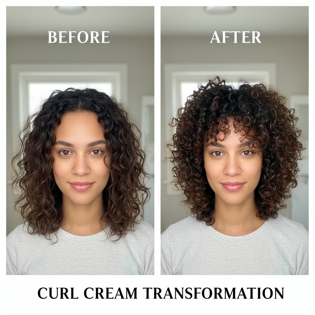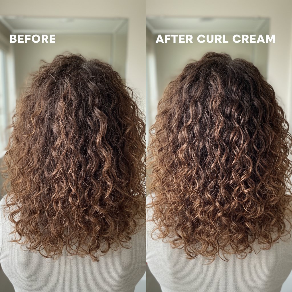 Before: Curls that lose shape quickly. After: Curls that stay defined all day, proving the long-lasting effect of curl cream.
