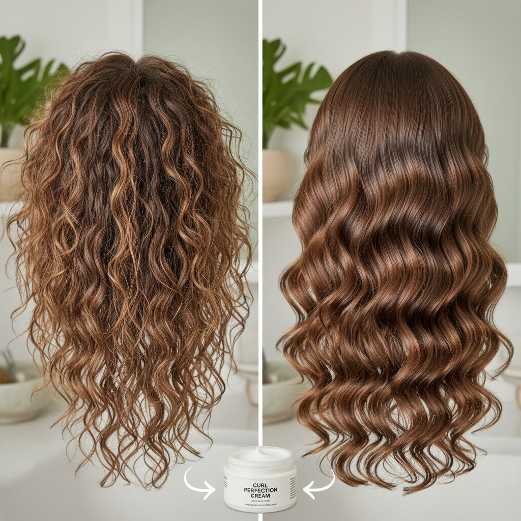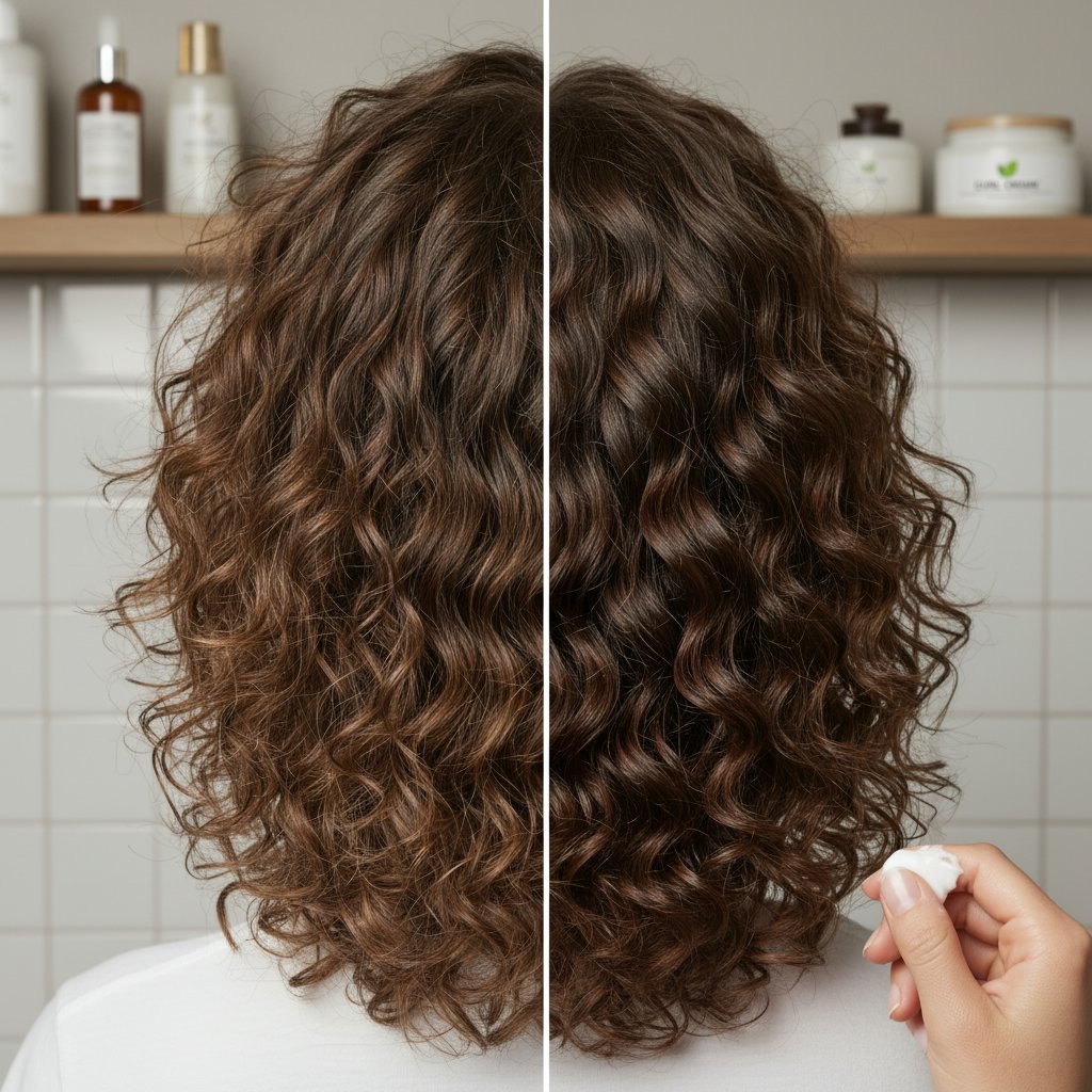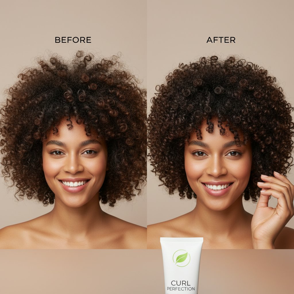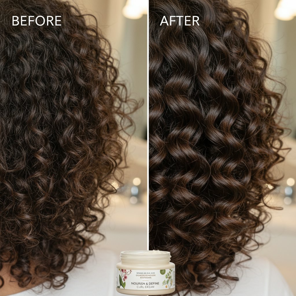 Before: Curls that lose shape quickly. After: Curls that stay defined all day, proving the long-lasting effect of curl cream.