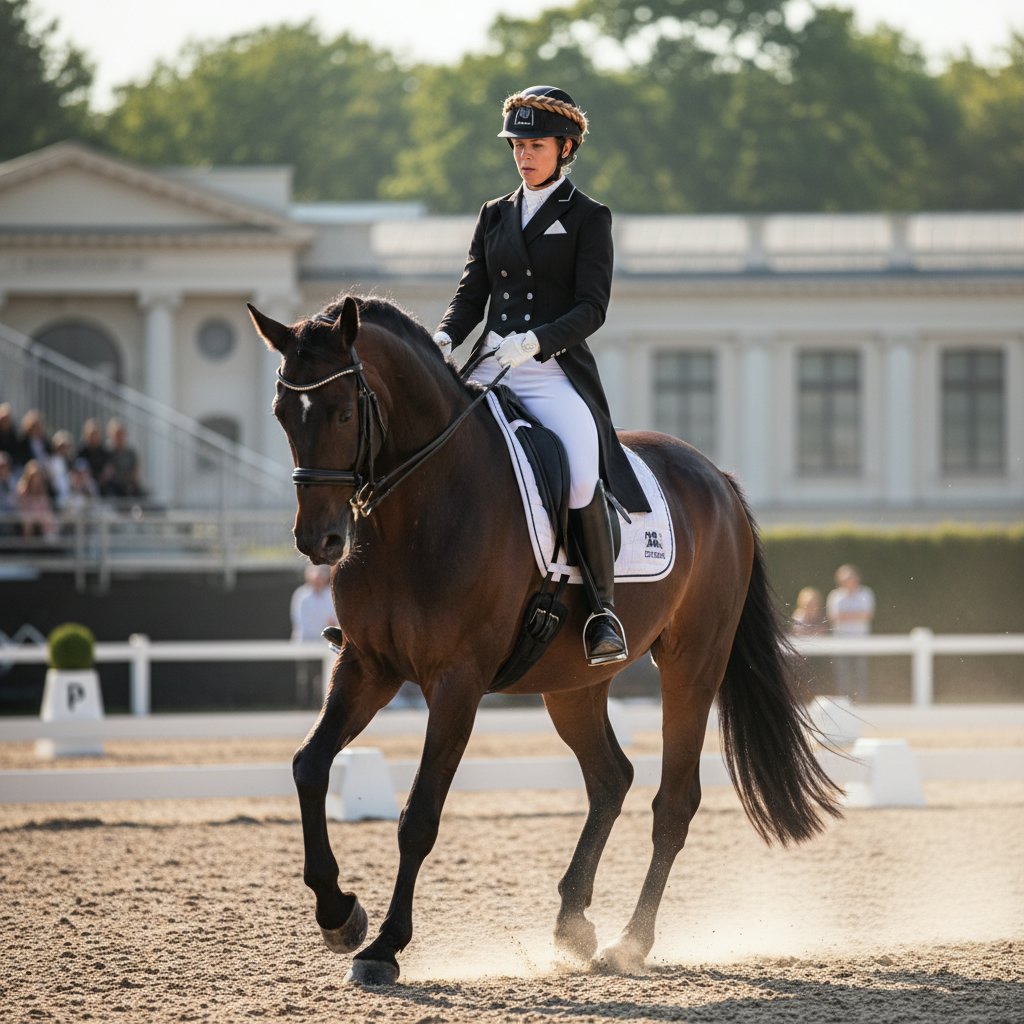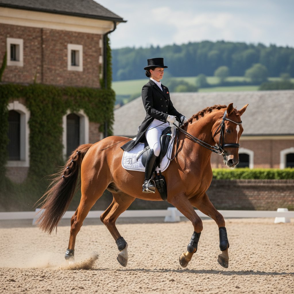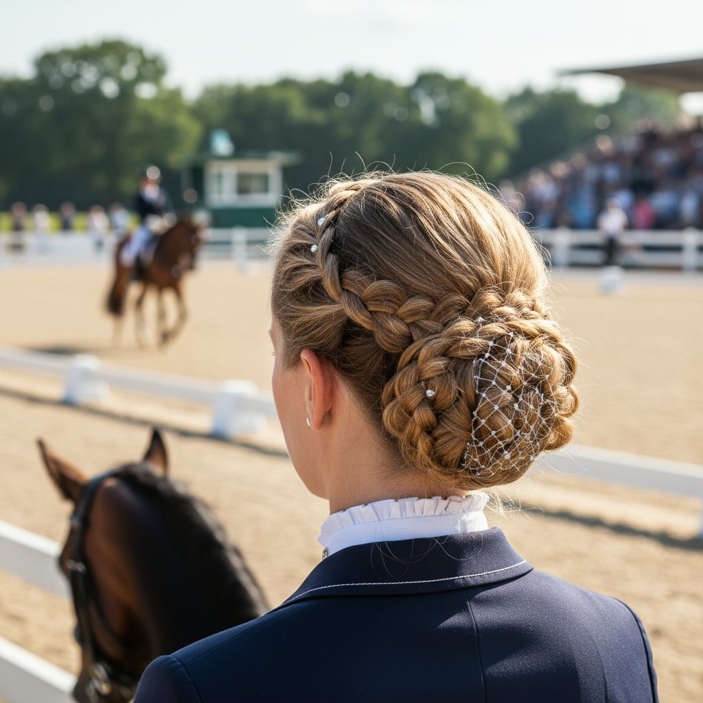 An updo featuring intricate braids not only secures the hair but also reflects the complex beauty of dressage movements.