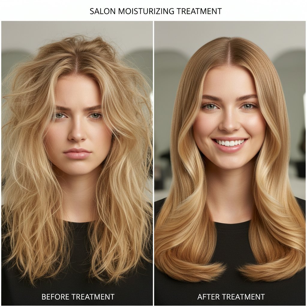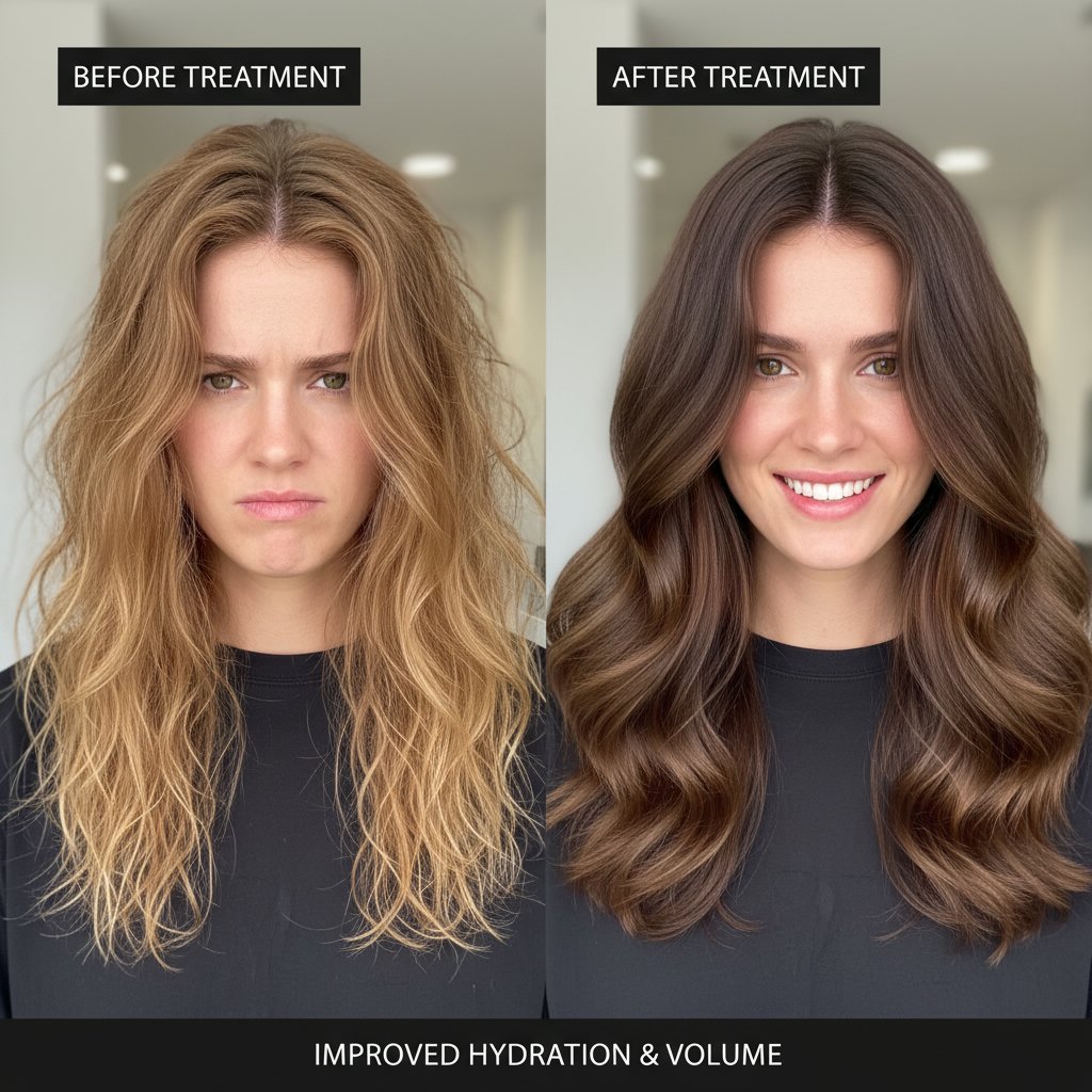 Dull, lifeless hair turned vibrant and shiny after a series of moisturizing salon treatments.