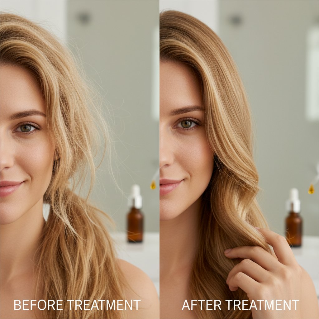 Before and after an oil treatment, highlighting the nourishment and luster added to dry strands.
