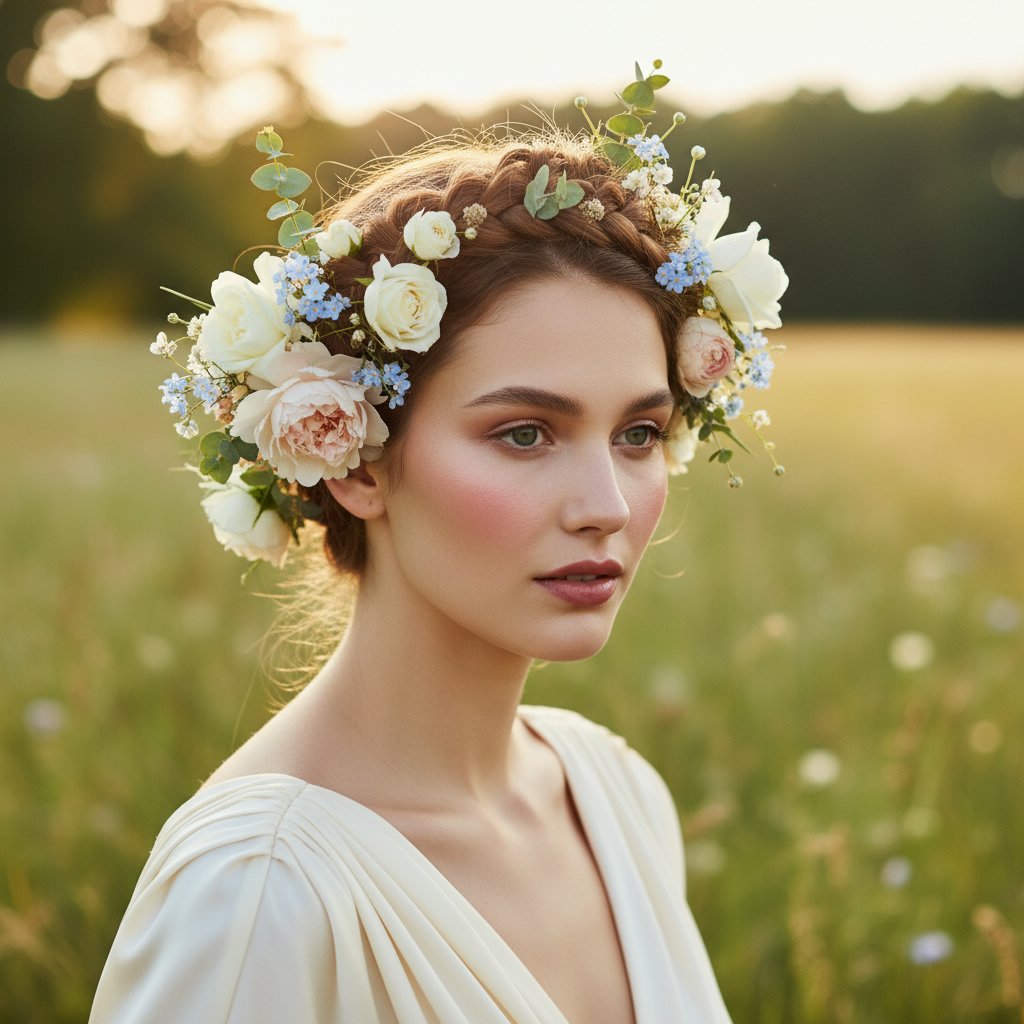 Braided crowns, interwoven with flowers and delicate accessories, evoke a sense of romance and whimsical charm.