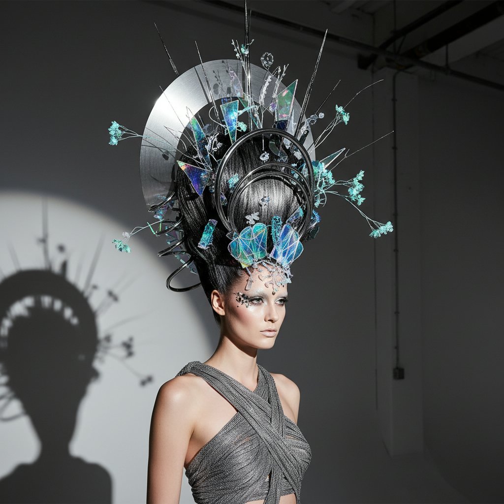 This look integrates avant-garde accessories into the hairstyle, creating a fusion of fashion and function that captivates and inspires.