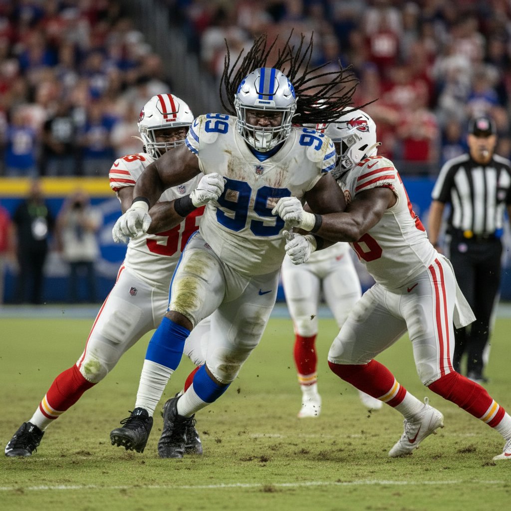 Powerful dreadlocks tied back, symbolizing strength and resilience on the defensive line.