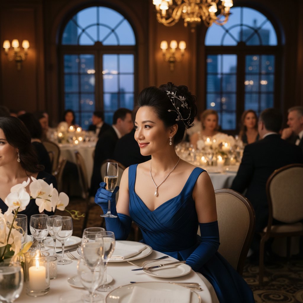A refined chignon sits at the nape of the neck, embodying timeless elegance ideal for any formal fundraising gala.