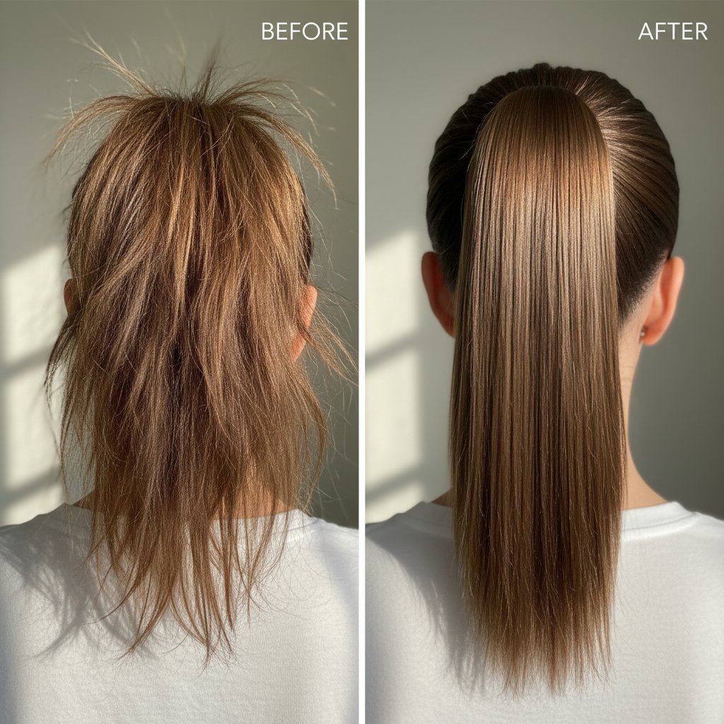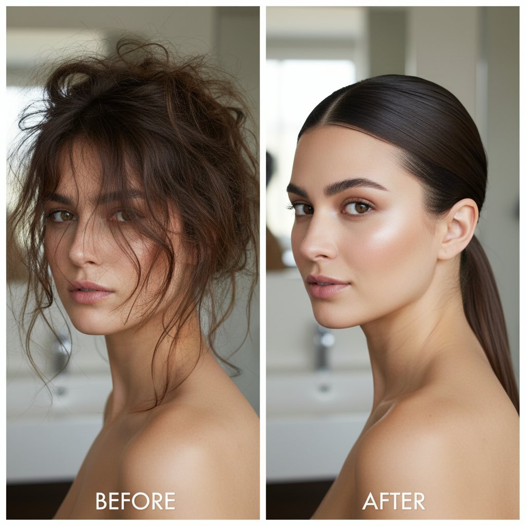 Before: Flyaways disrupt a smooth look. After: A sleek, polished ponytail, achieved with strong hold gel.