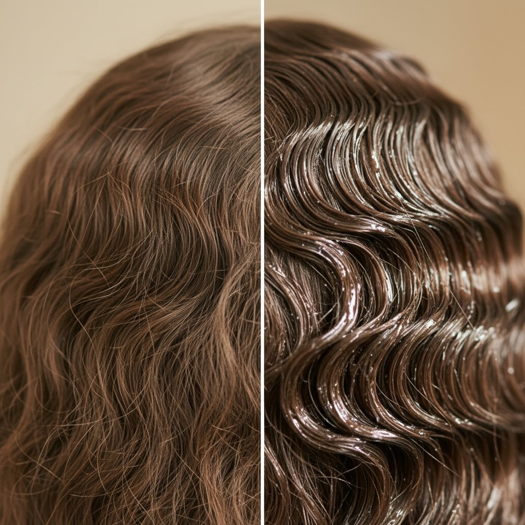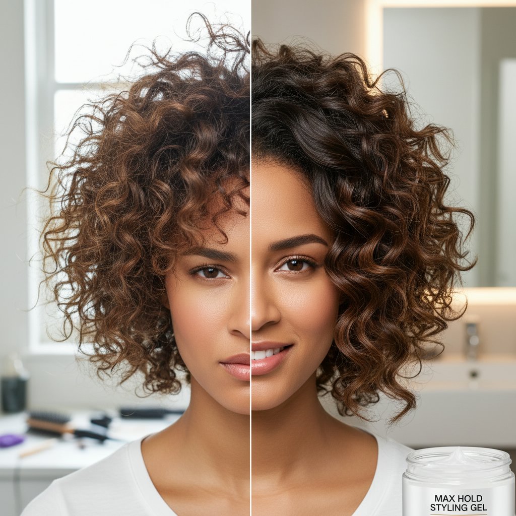 Before: Frizz that overwhelms styles. After: Smooth, controlled hair with no frizz in sight, proving the gel's smoothing abilities.