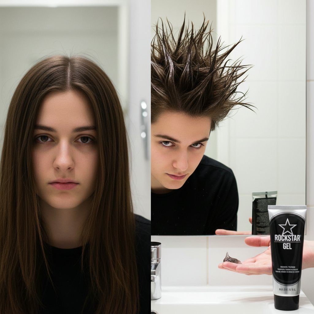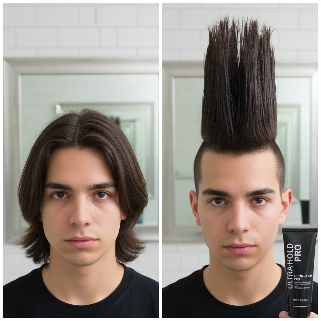 Before: Hair that falls flat. After: A towering, sculpted mohawk, demonstrating the gel's holding capabilities.