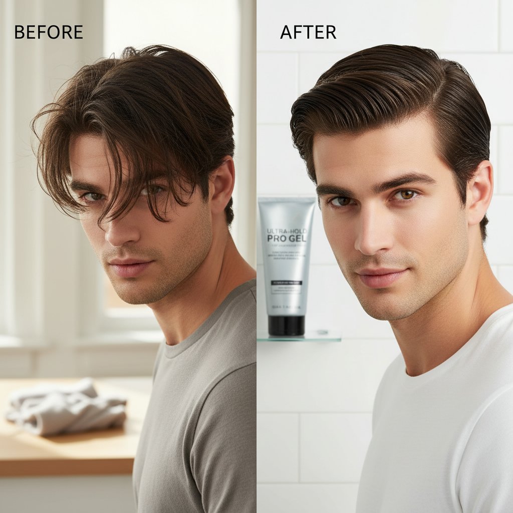Before: Unruly, hard-to-manage hair. After: Perfectly slicked-back style, showcasing the gel's firm grip.