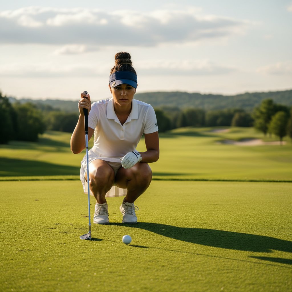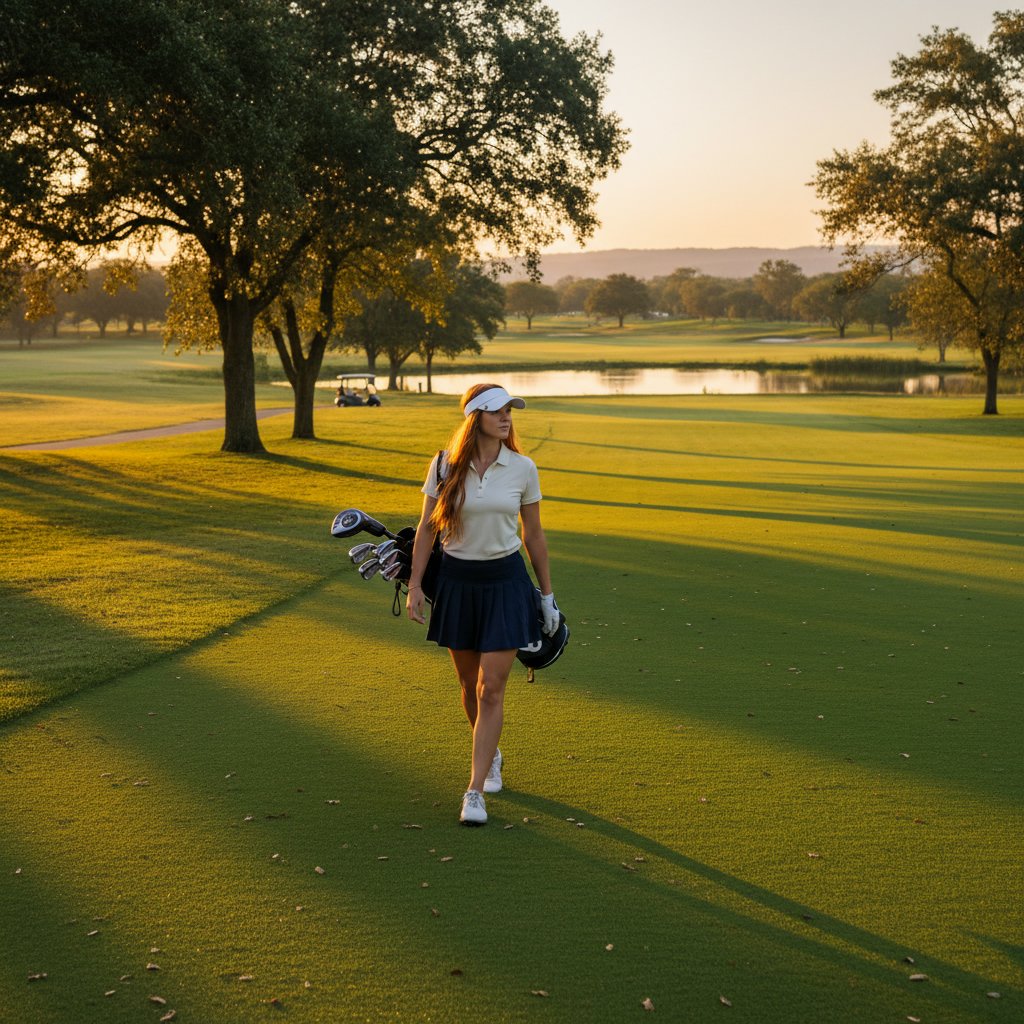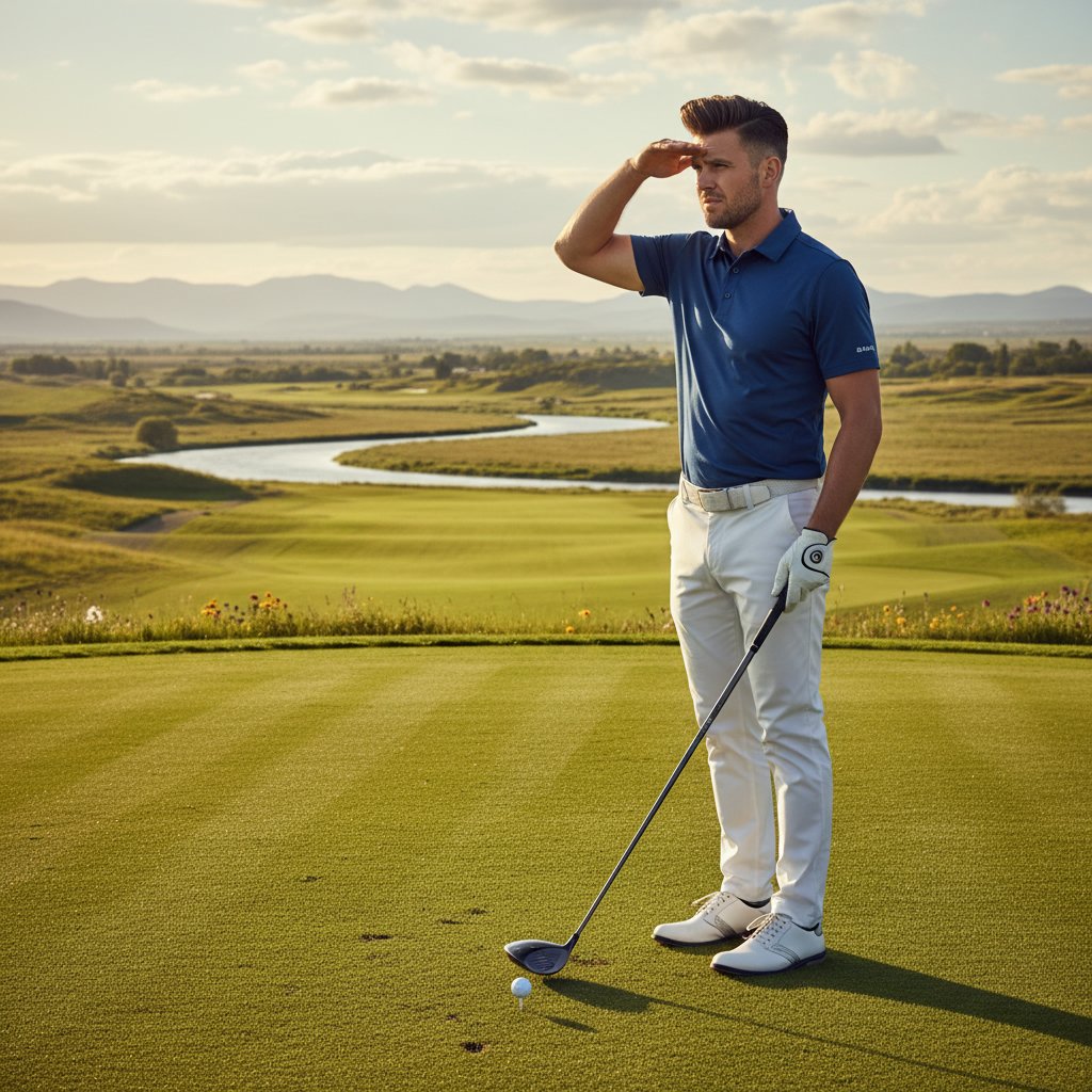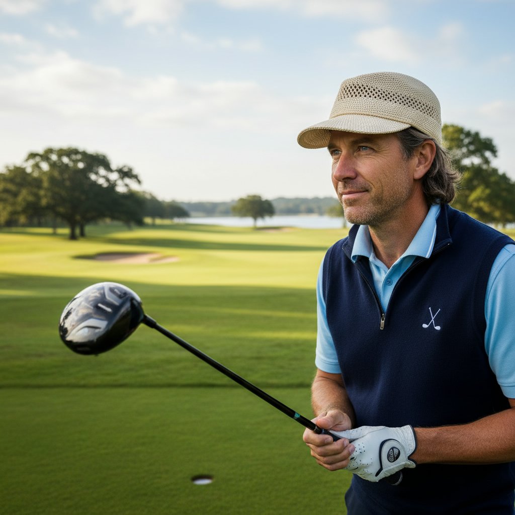 Long hair gracefully tamed under a golf hat, blending functionality with a laid-back vibe on the course.