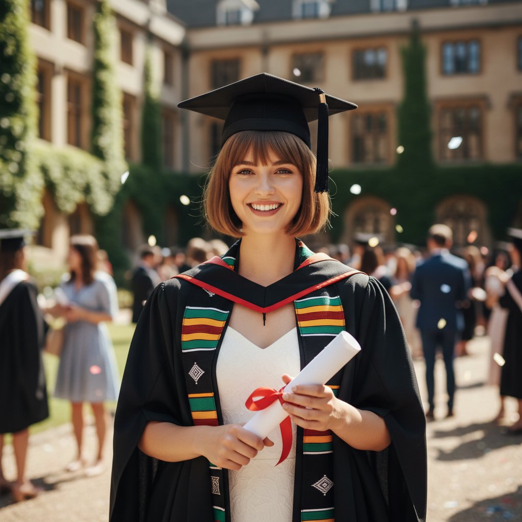 A sleek bob with a middle part, offering a modern and clean look that complements the ceremonial attire and graduation cap.