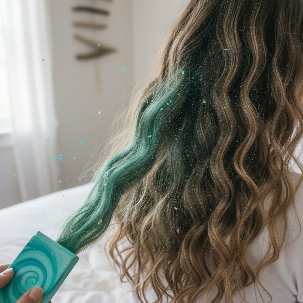 Waves of mermaid green through long locks evoke oceanic dreams, ideal for a magical, aquatic-inspired look.