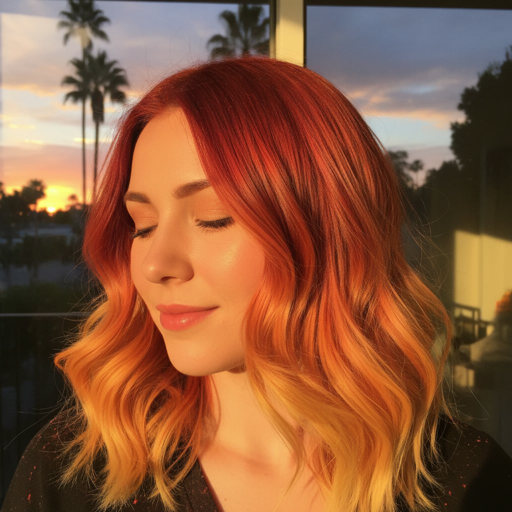 A sunset ombre effect with hair chalk blends fiery reds, oranges, and yellows, mimicking the beauty of a sunset.