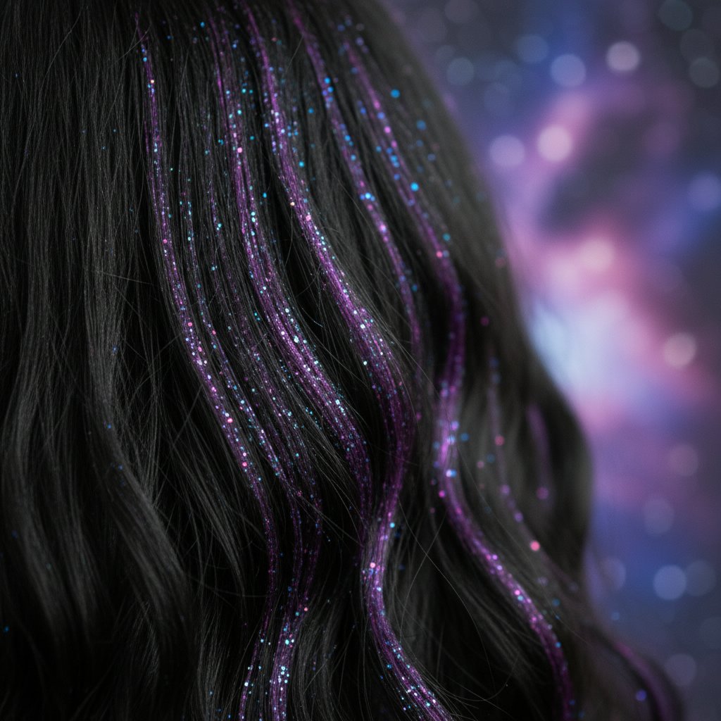 Galactic purple streaks through black hair create a cosmic effect, perfect for adding a mysterious, interstellar vibe.