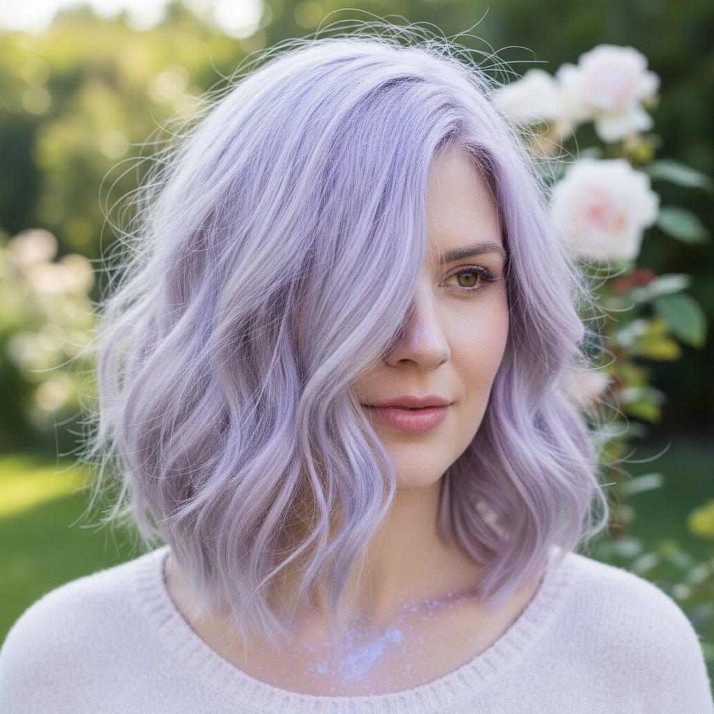 An all-over pastel lavender chalk color transforms hair into a soft, ethereal cloud, perfect for a fairy-tale inspired style.