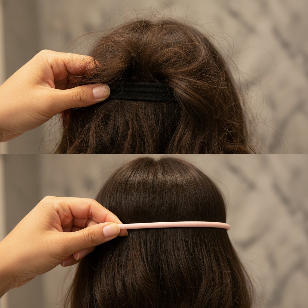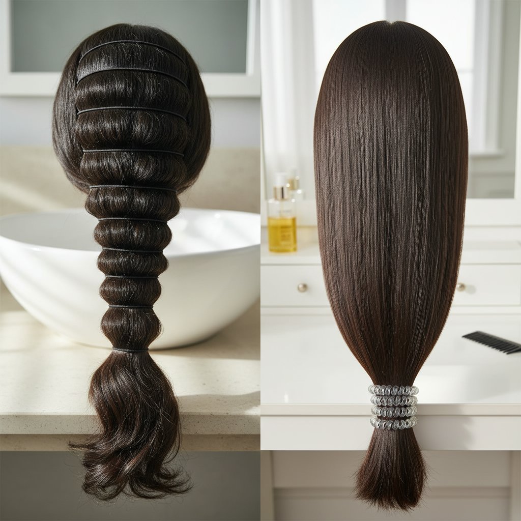 Before: Broken strands from tight elastics. After: Healthy, intact hair using wide fabric elastics for a gentle hold.