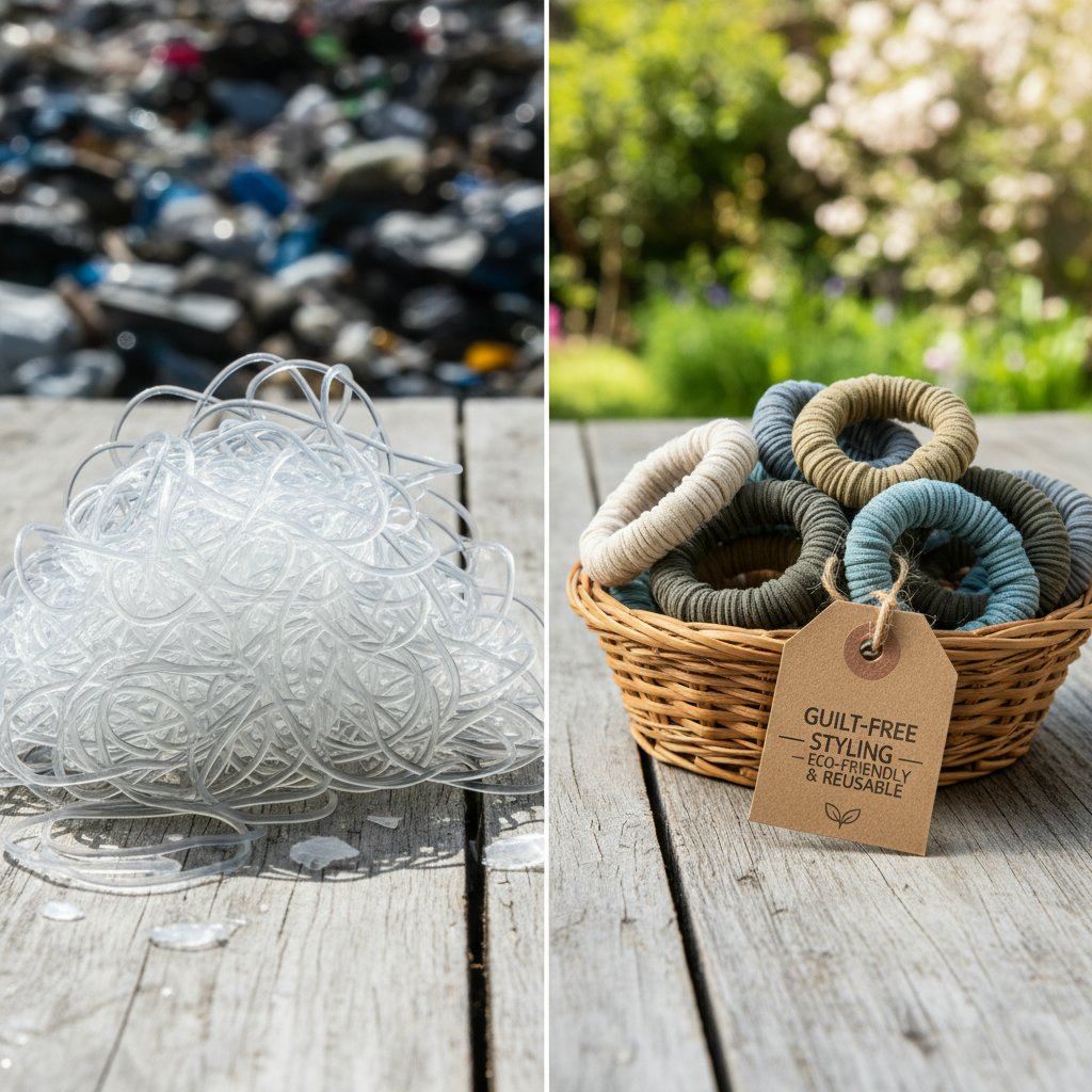 Before: Single-use plastic elastics. After: Reusable, eco-friendly elastics for guilt-free styling.