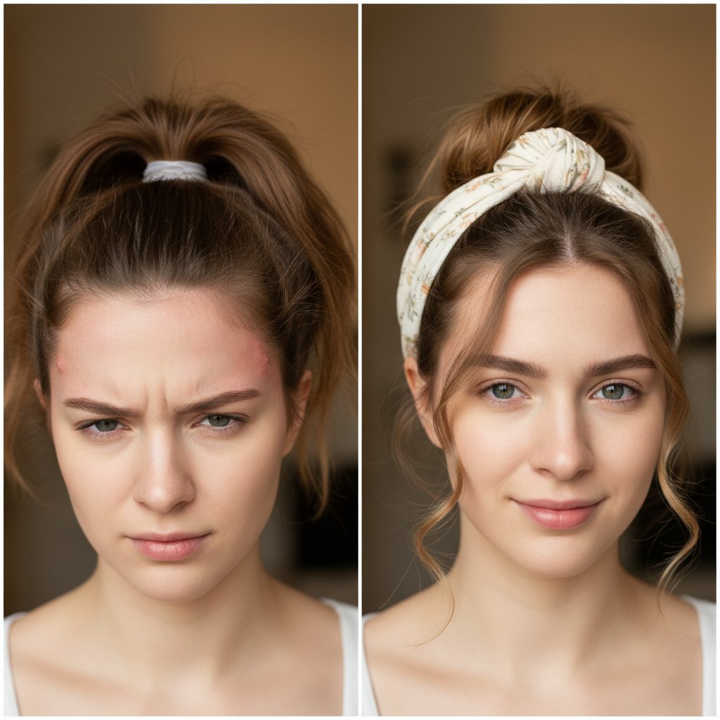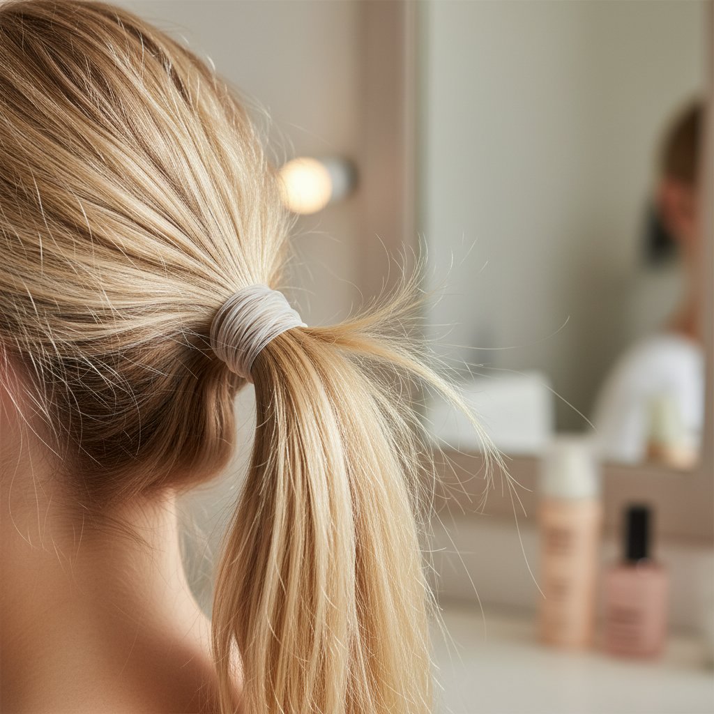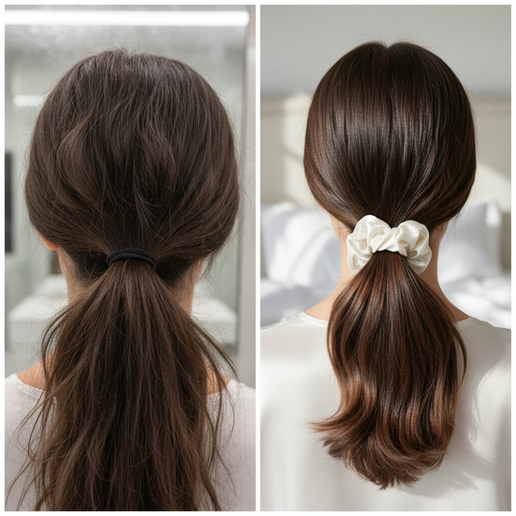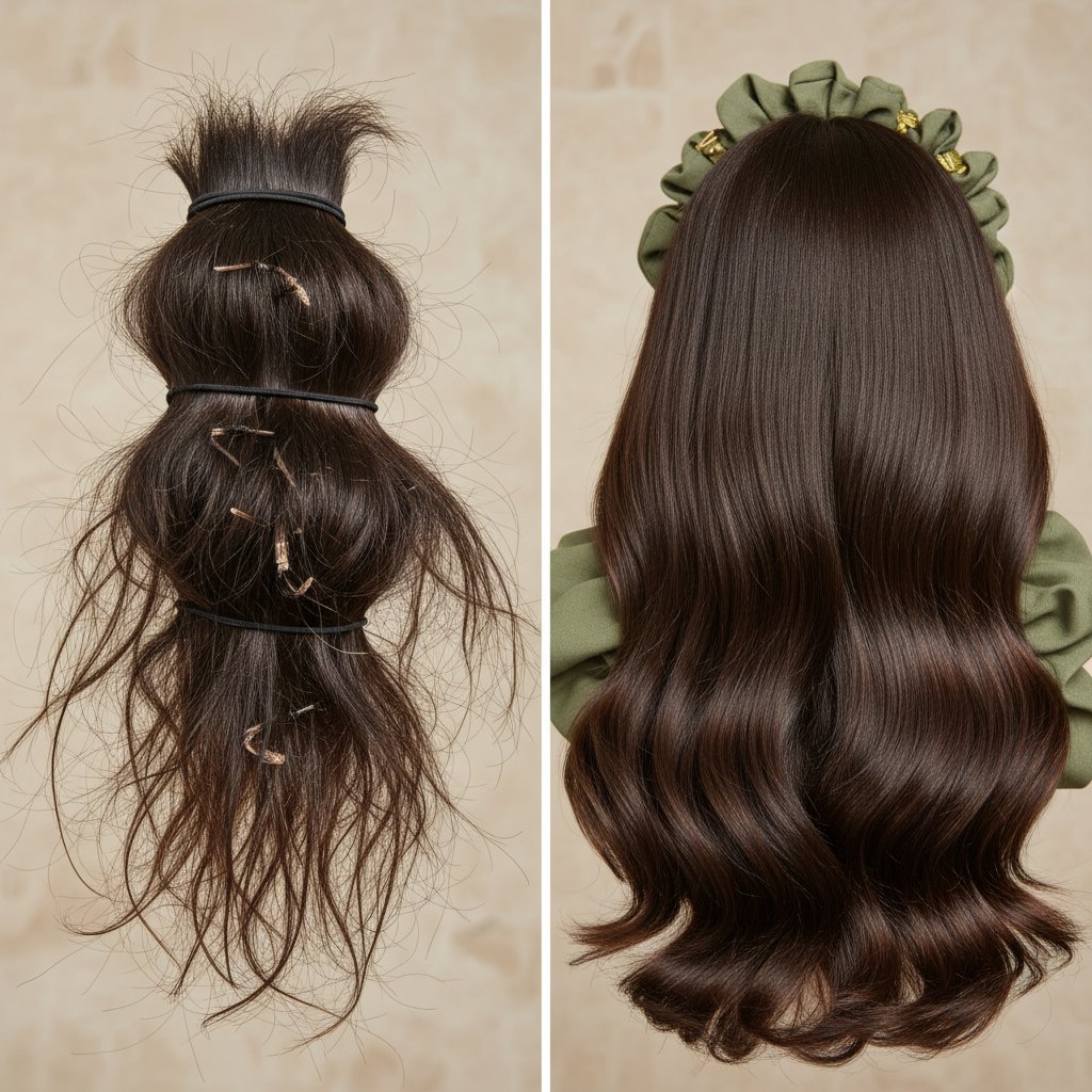 Before: Dull, damaged hair from elastic use. After: Lustrous, protected hair styled with silk hair ties.