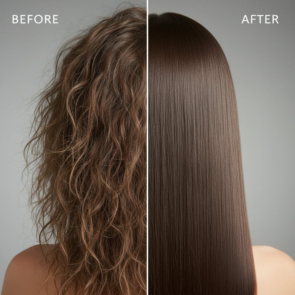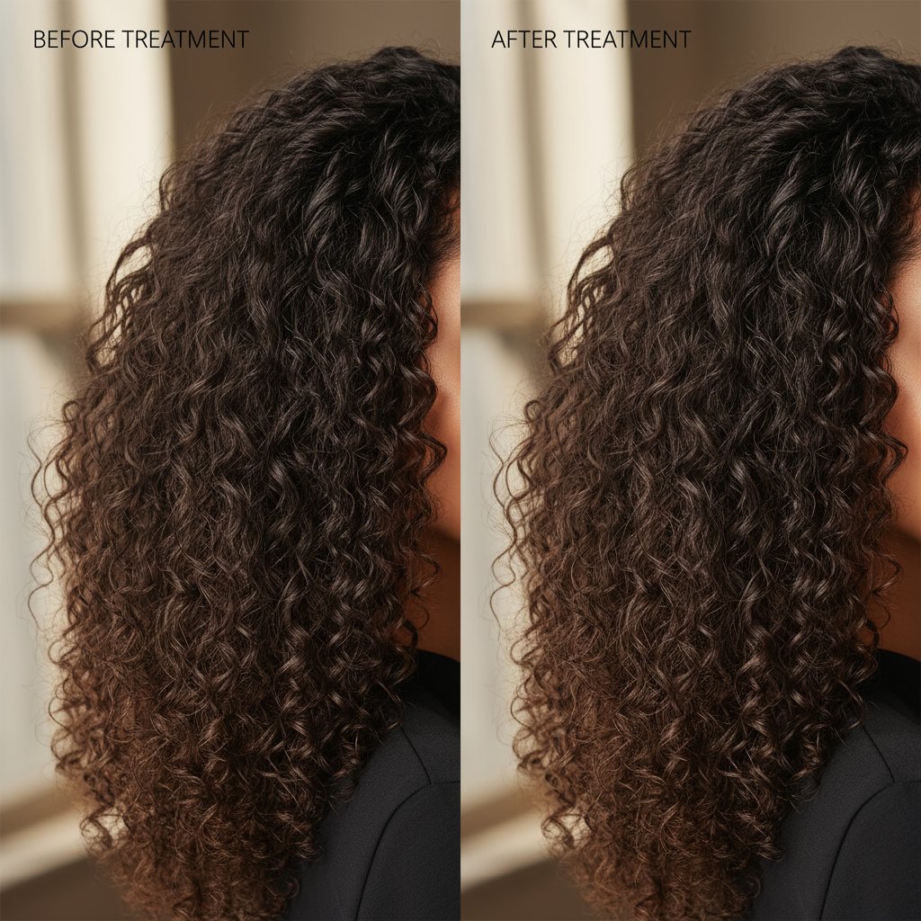 Before: Dry, coarse strands. After: Silky softness and a radiant shine that highlights the hair's improved health.
