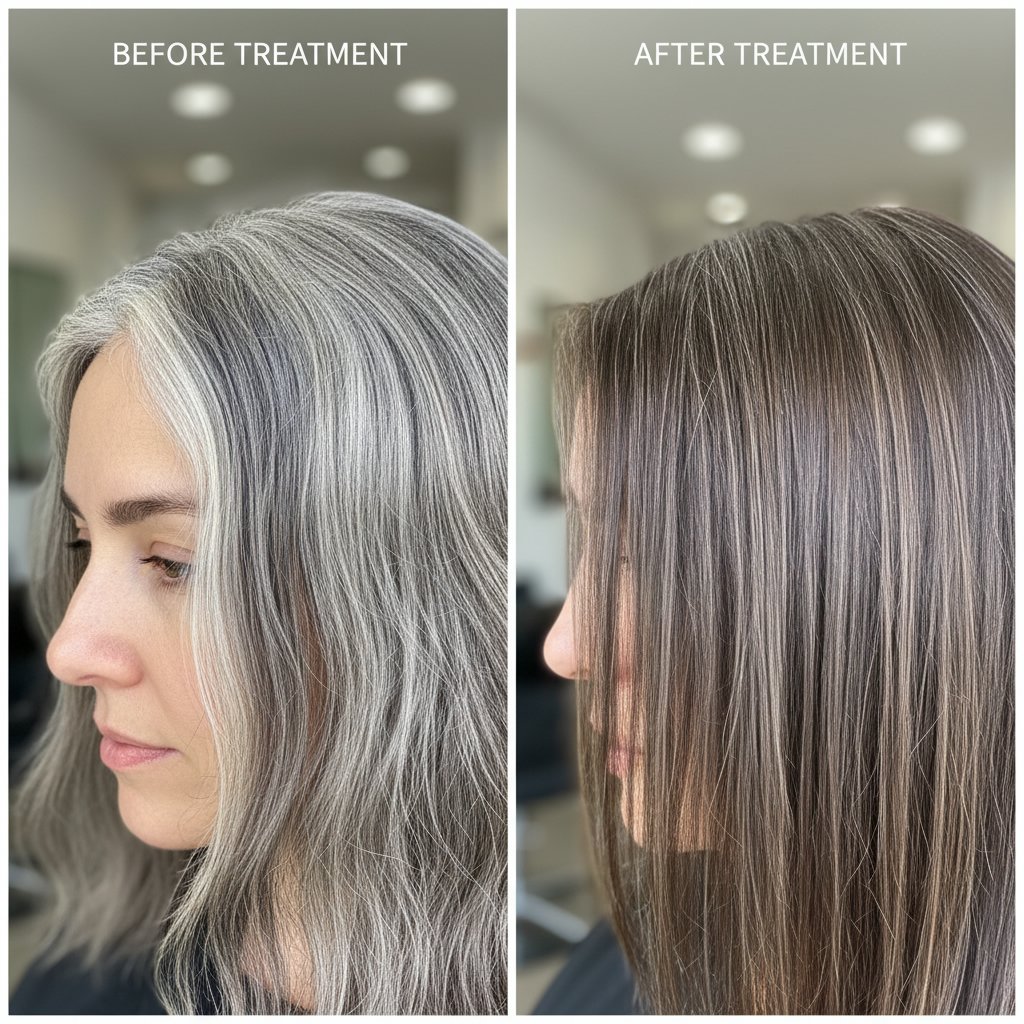 Before: Grays standing out against natural color. After: Grays subtly blended into the rest of the hair, softened by the gloss.