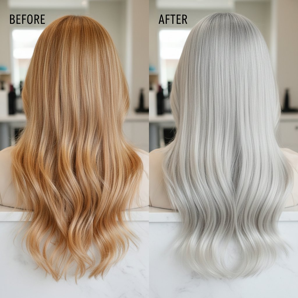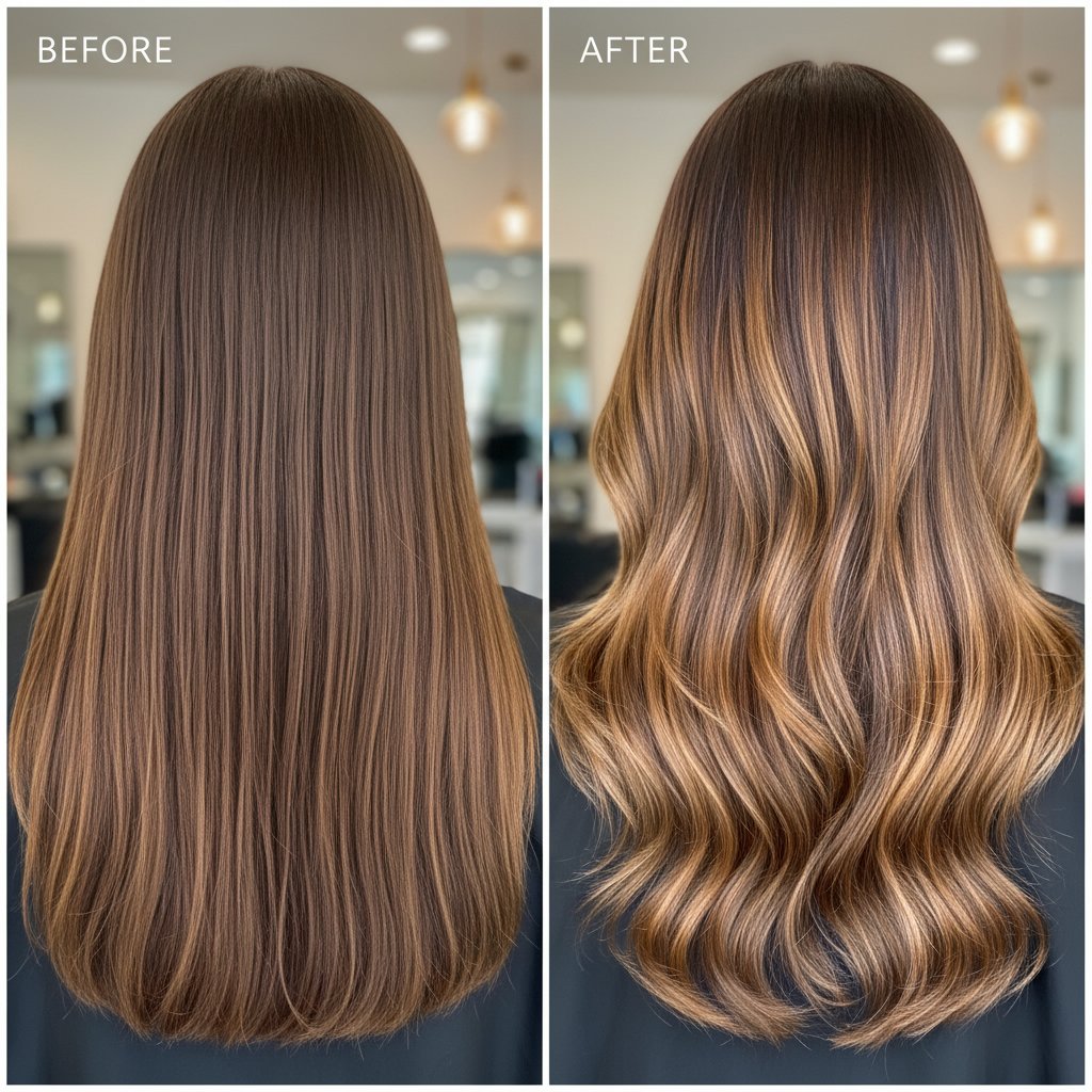Before: Single-tone hair lacking dimension. After: Multi-dimensional tones emerging, enriched by the depth-adding gloss.