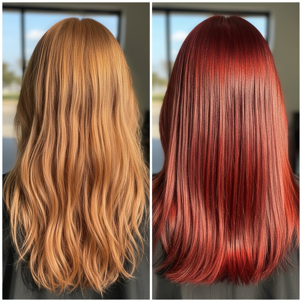 Before: Red hair looking washed out. After: Vibrant, fiery reds with a polished sheen, reinvigorated by a gloss service.