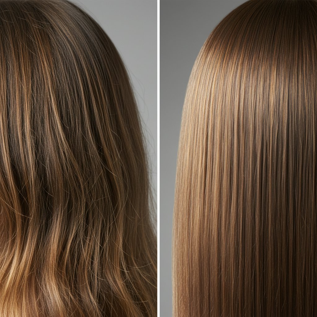 Before: Frizzy, unruly hair. After: Sleek, smooth texture with a noticeable increase in shine, demonstrating gloss's conditioning benefits.