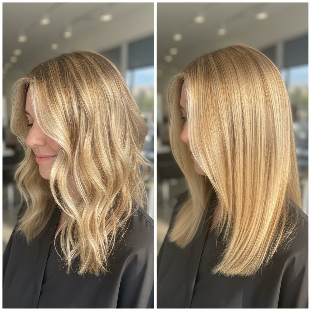 Before: Blonde hair that's become brassy. After: Cooler, brighter blonde tones with a glassy finish, thanks to a targeted gloss treatment.