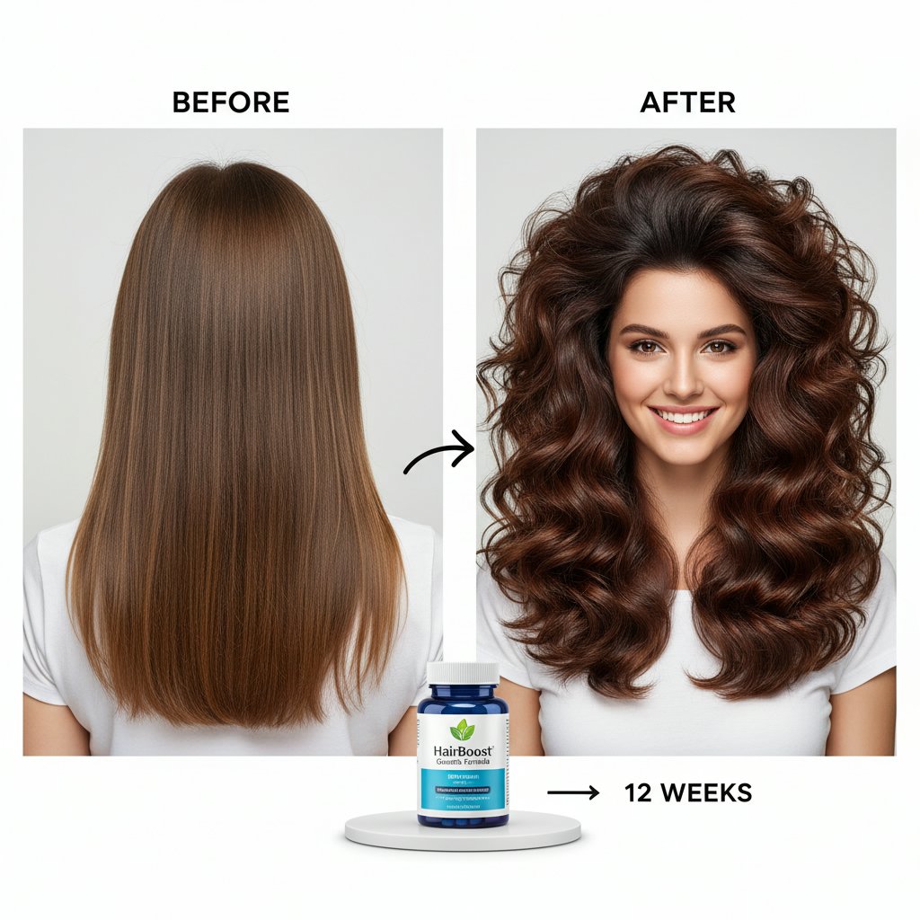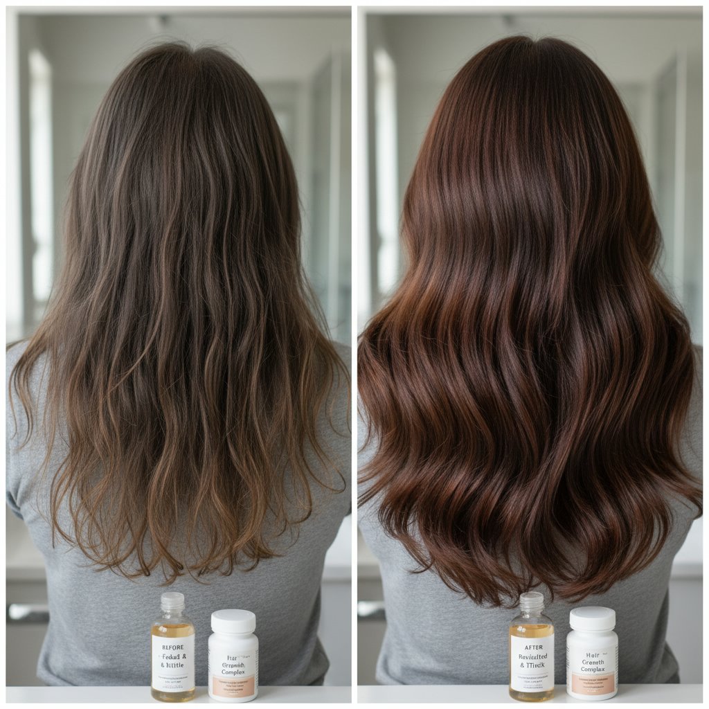Before: Flat, lifeless hair. After: Dramatically boosted volume, highlighting the power of consistent supplement intake.