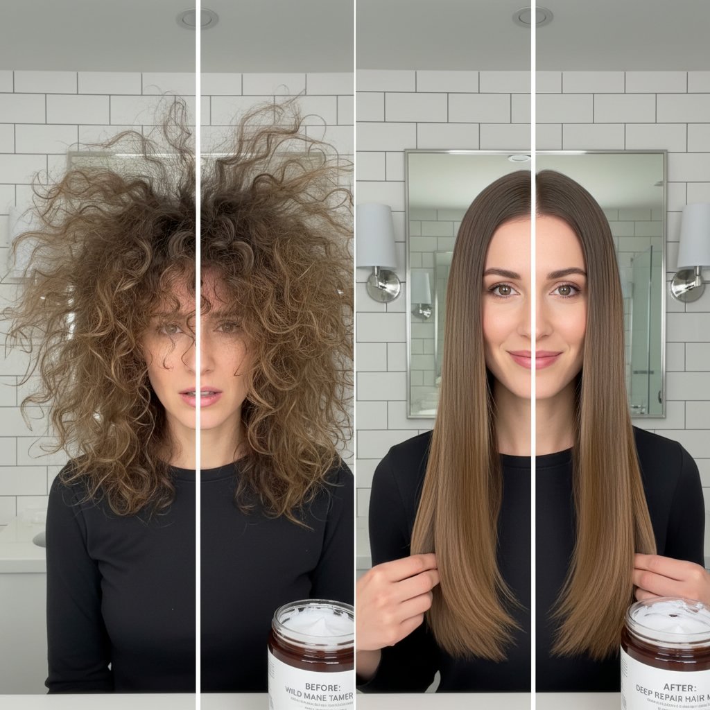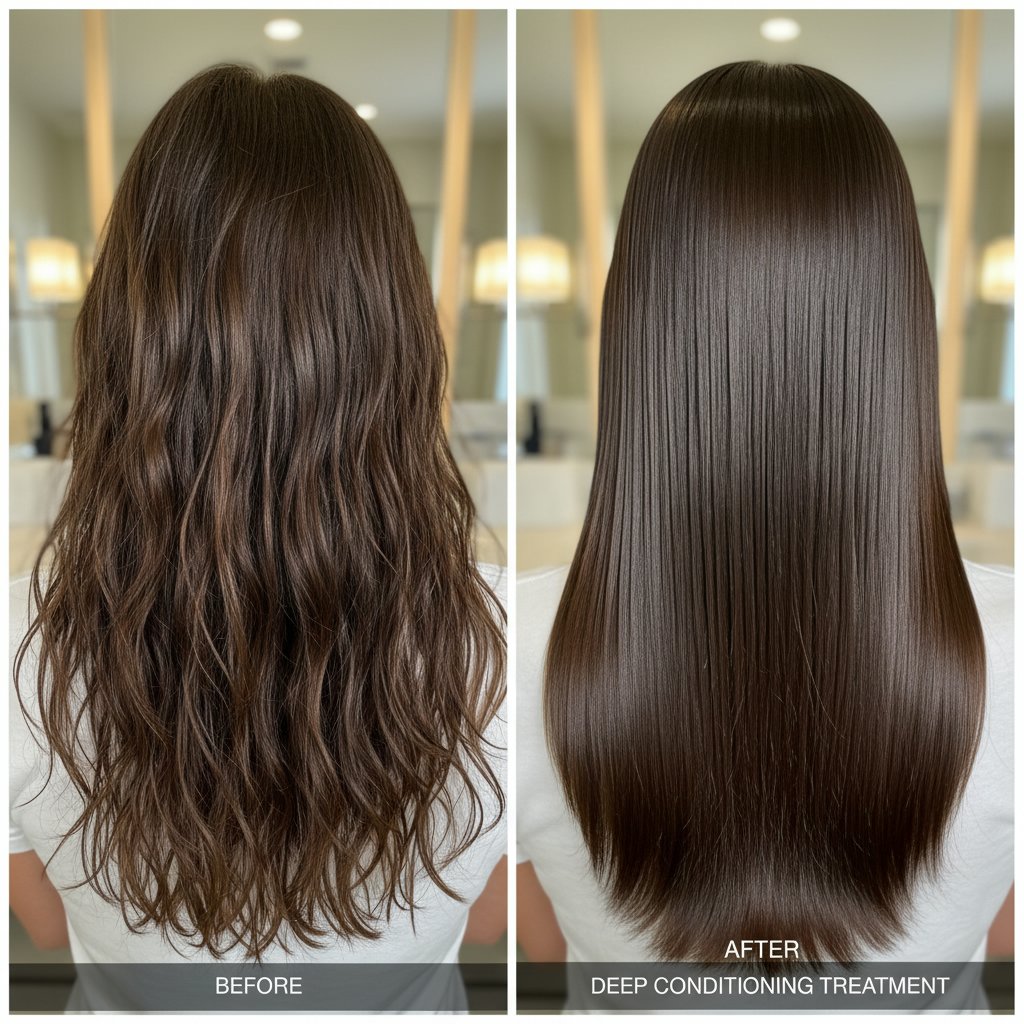 Before: Unruly frizz. After: Smooth, controlled strands with a noticeable shine, showcasing the frizz-taming prowess of deep conditioning.