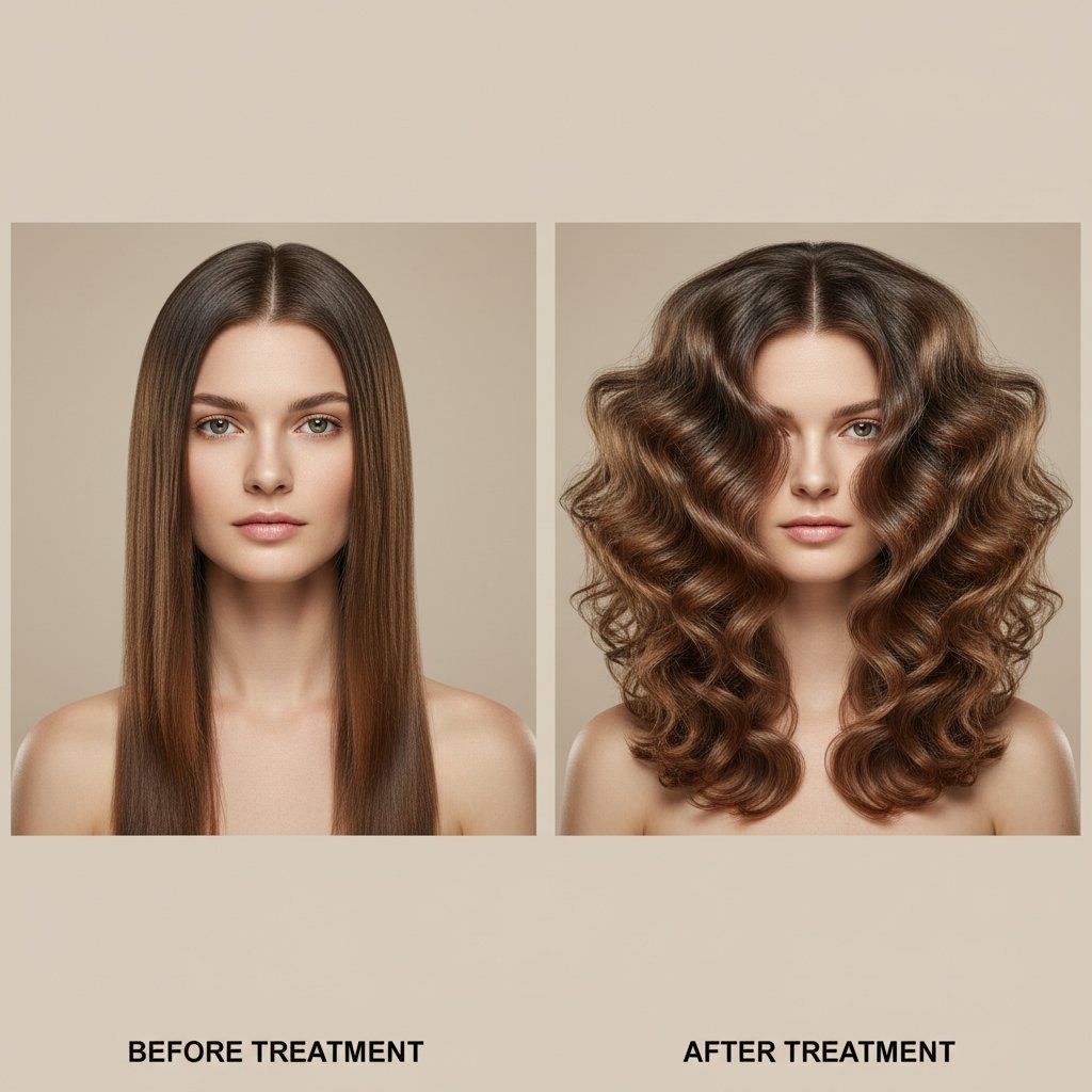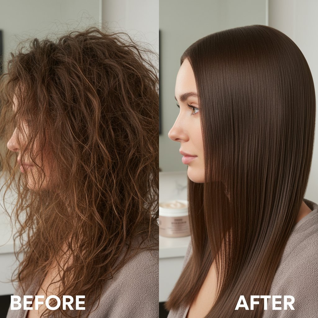 Before: Puffy, difficult to manage. After: Sleek, easily manageable hair, highlighting the smoothing effect of hair masks.