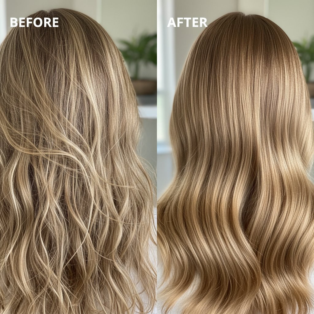 Before: Dull, matte finish. After: Lustrous, glossy hair that reflects light, showcasing the shine-enhancing benefits of hair masks.