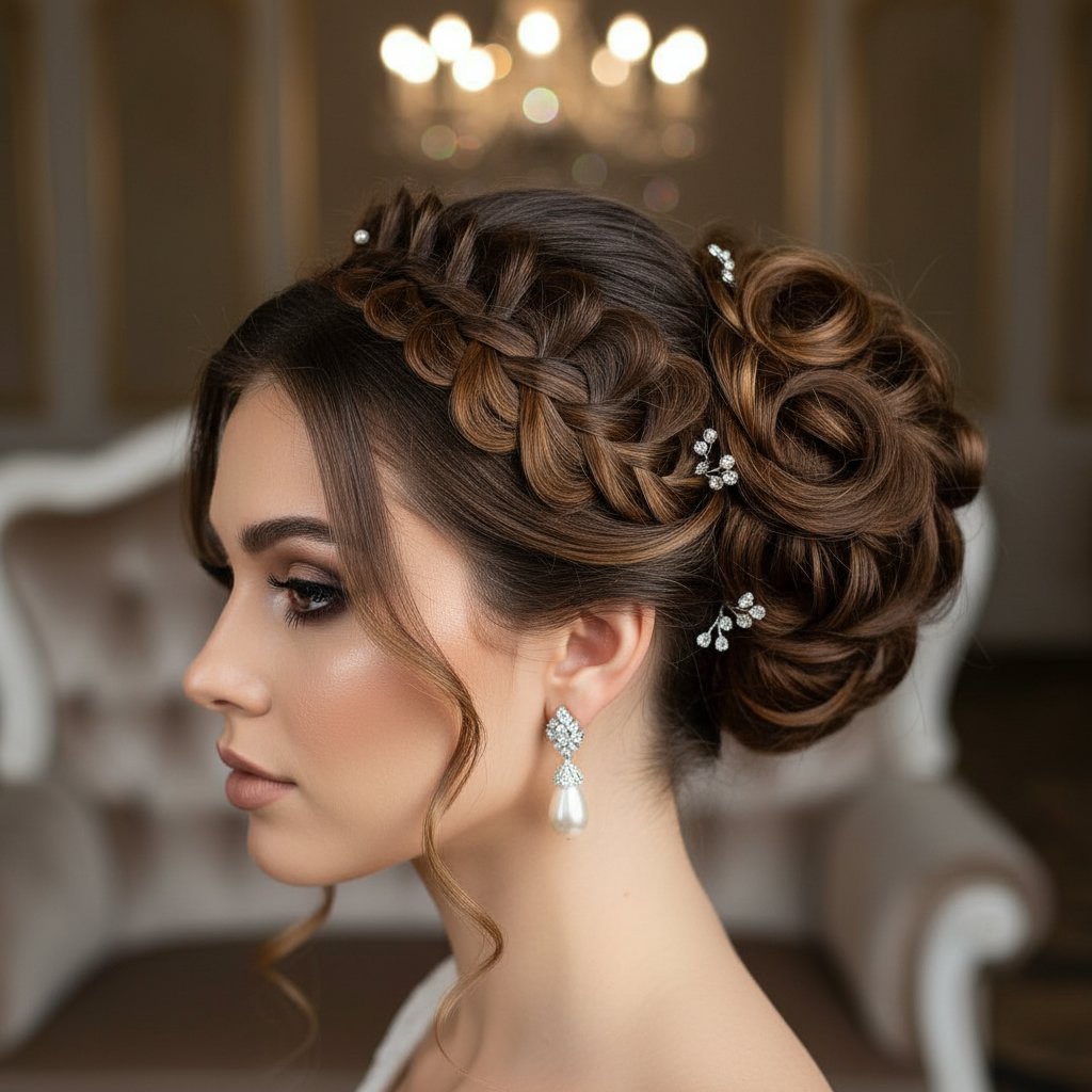 This elegant updo, perfect for special occasions, demonstrates our stylist's finesse with intricate hairstyling.