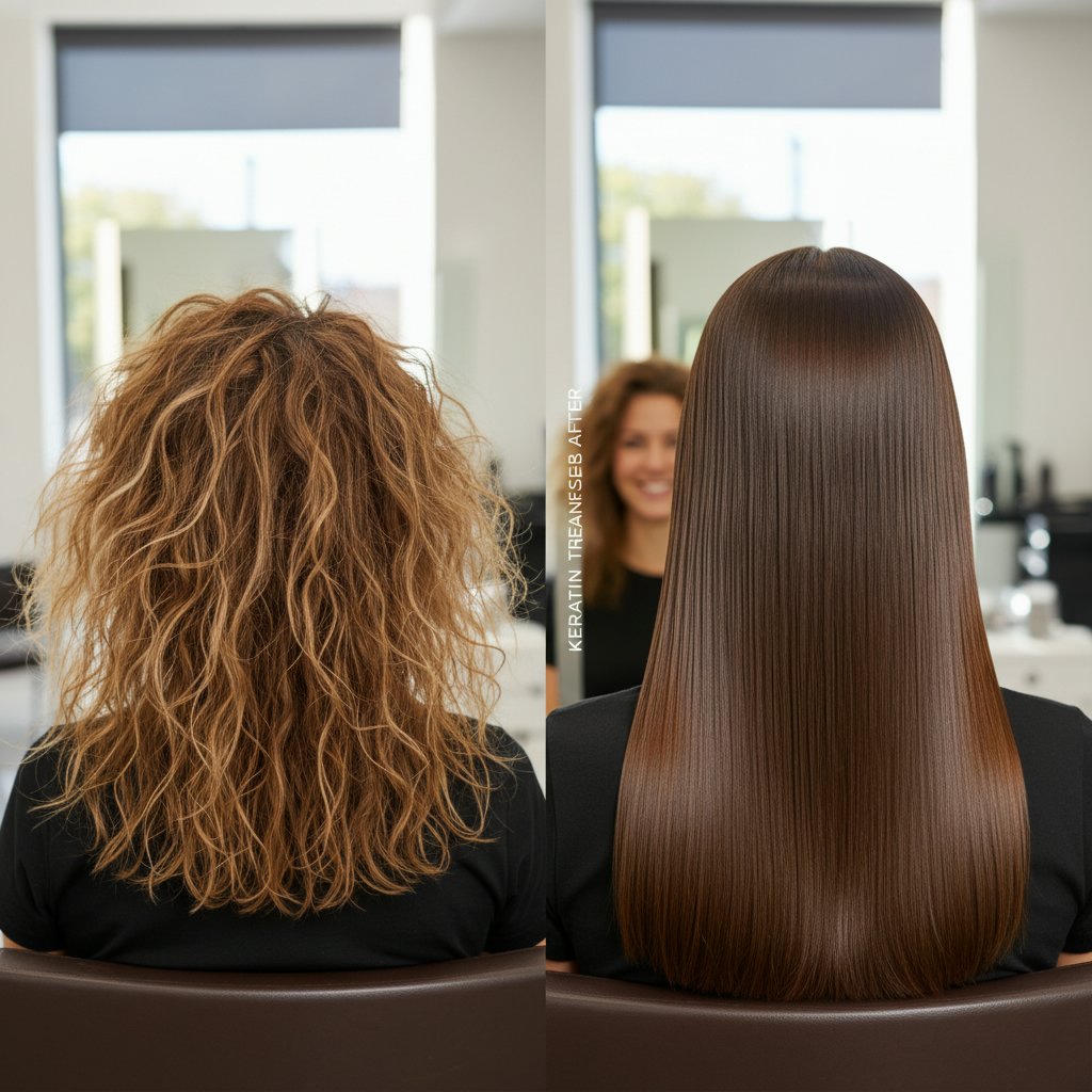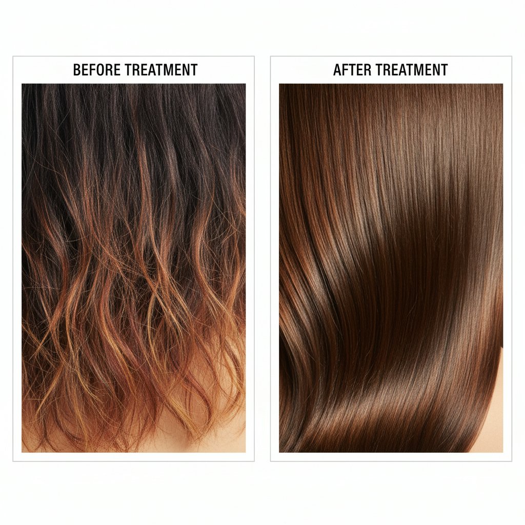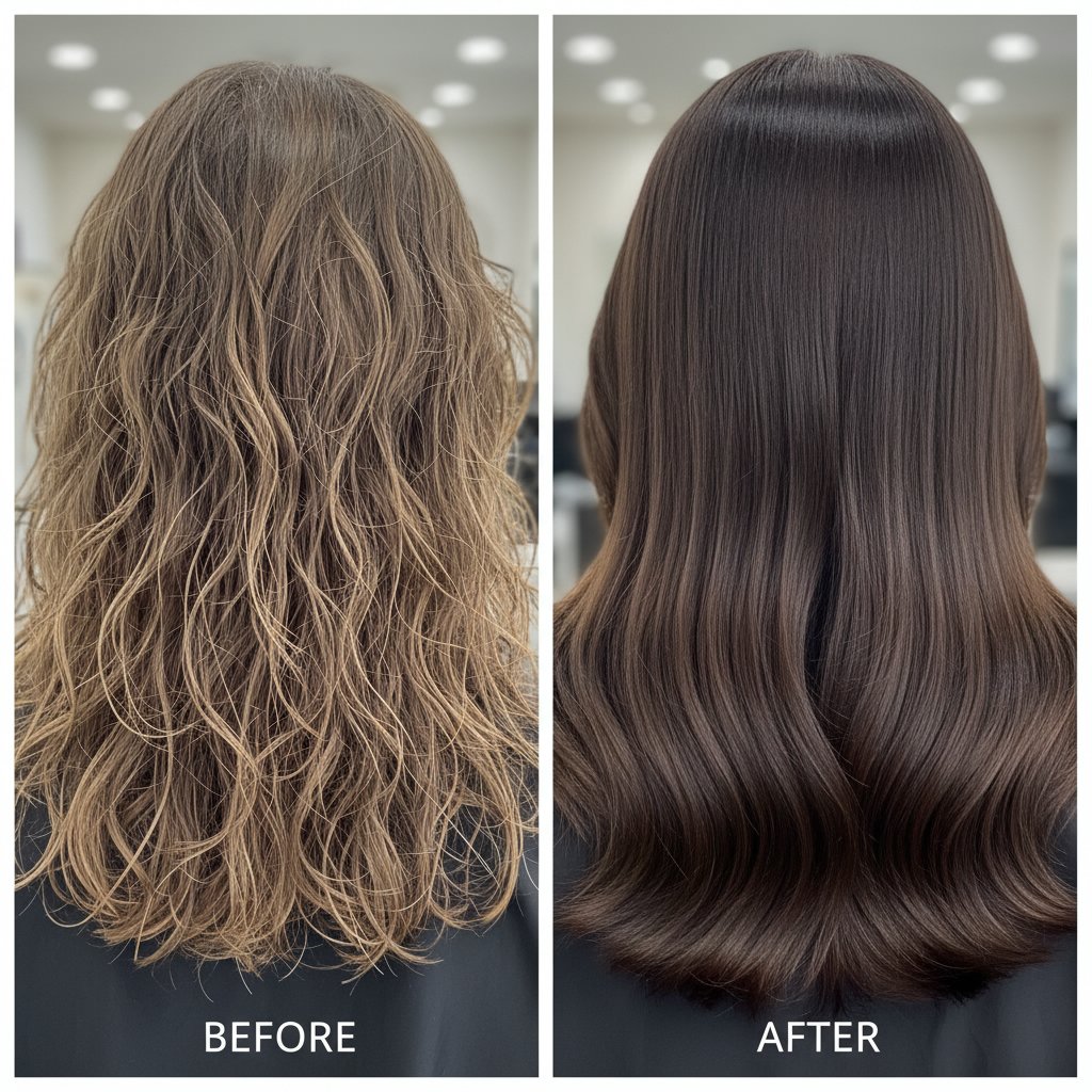 Frayed, frizzy ends are tamed into sleek smoothness, showcasing the smoothing capabilities of keratin treatments.