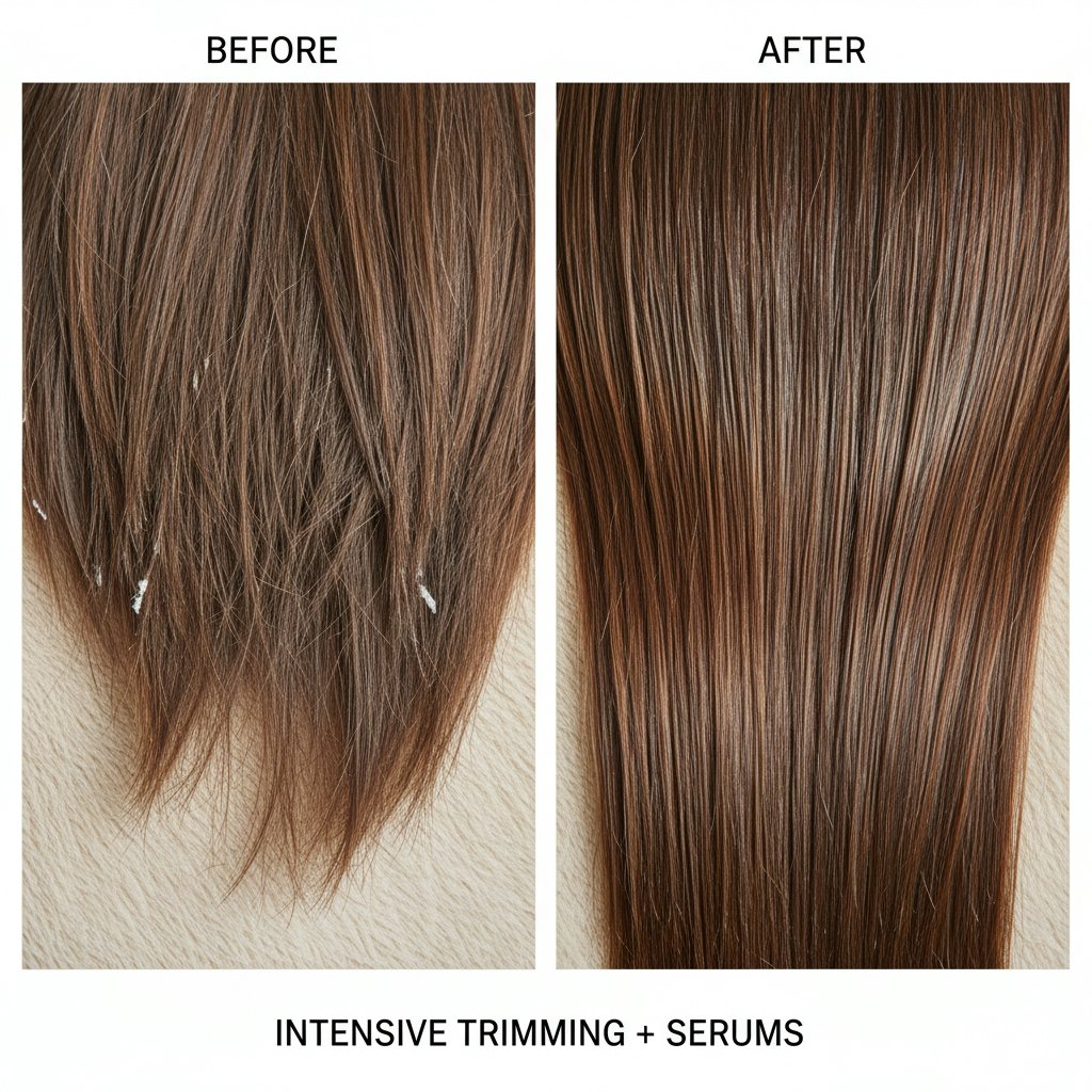 The solution to split ends is clear in this transformation, where intensive trimming and serums restore hair to sleek unity.